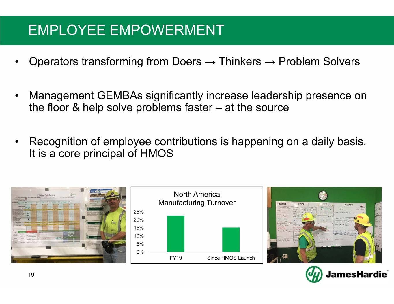 EMPLOYEE EMPOWERMENT • Operators transforming from Doers → Thinkers → Problem Solvers • Management GEMBAs significantly increase leadership presence on the floor & help solve problems faster – at the source • Recognition of employee contributions is happening on a daily basis. It is a core principal of HMOS North America Manufacturing Turnover 25% 20% 15% 10% 5% 0% FY19 Since HMOS Launch 19