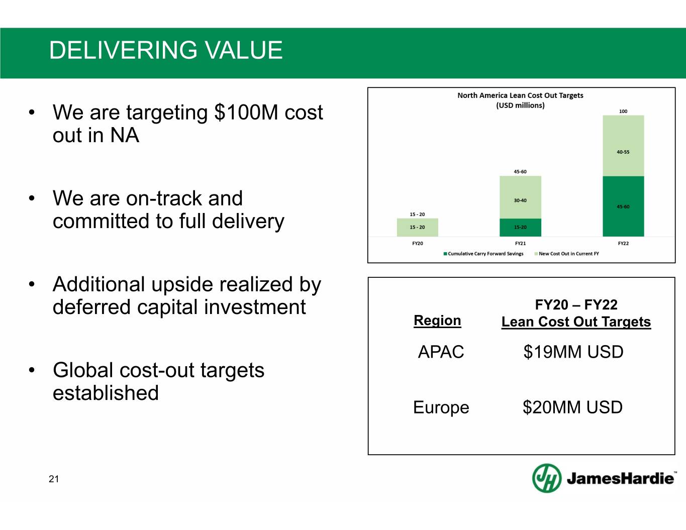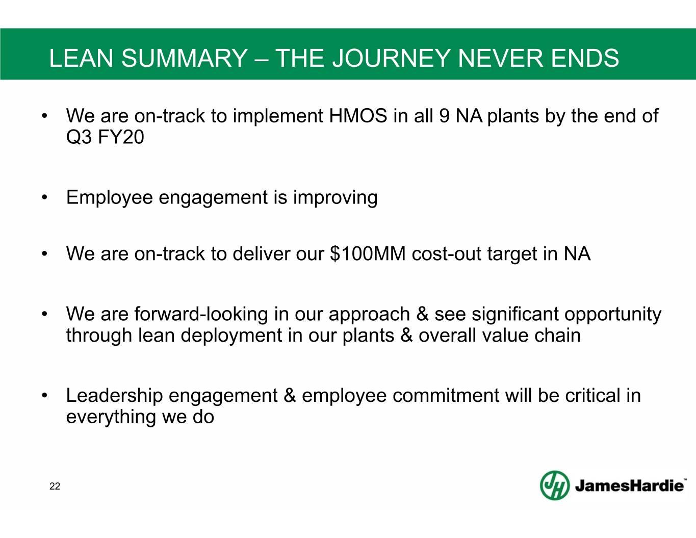 DELIVERING VALUE • We are targeting $100M cost out in NA • We are on-track and committed to full delivery • Additional upside realized by deferred capital investment FY20 – FY22 Region Lean Cost Out Targets APAC $19MM USD • Global cost-out targets established Europe $20MM USD 21