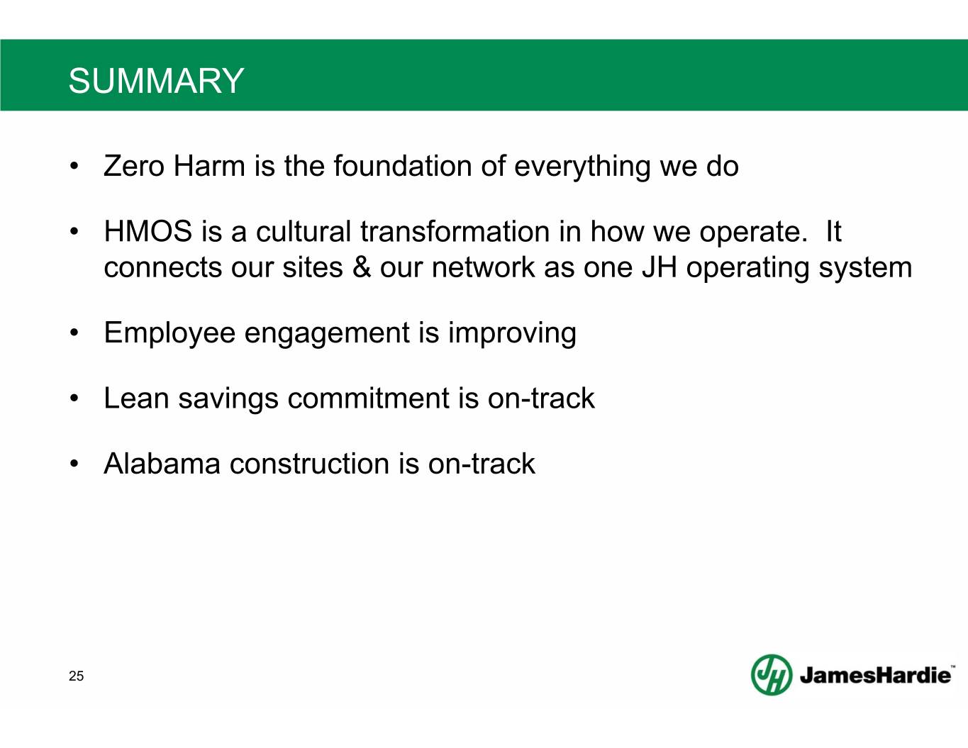SUMMARY • Zero Harm is the foundation of everything we do • HMOS is a cultural transformation in how we operate. It connects our sites & our network as one JH operating system • Employee engagement is improving • Lean savings commitment is on-track • Alabama construction is on-track 25