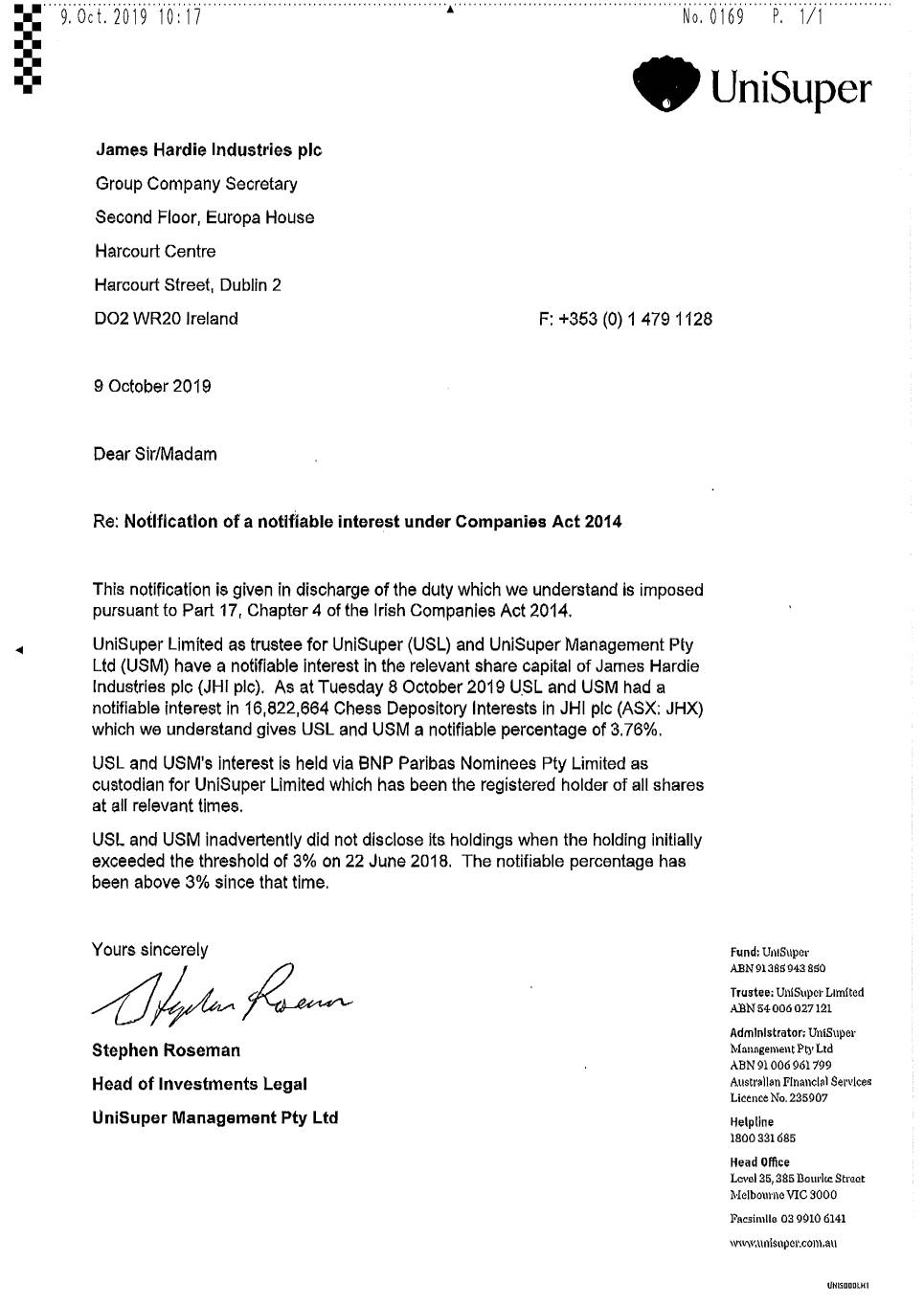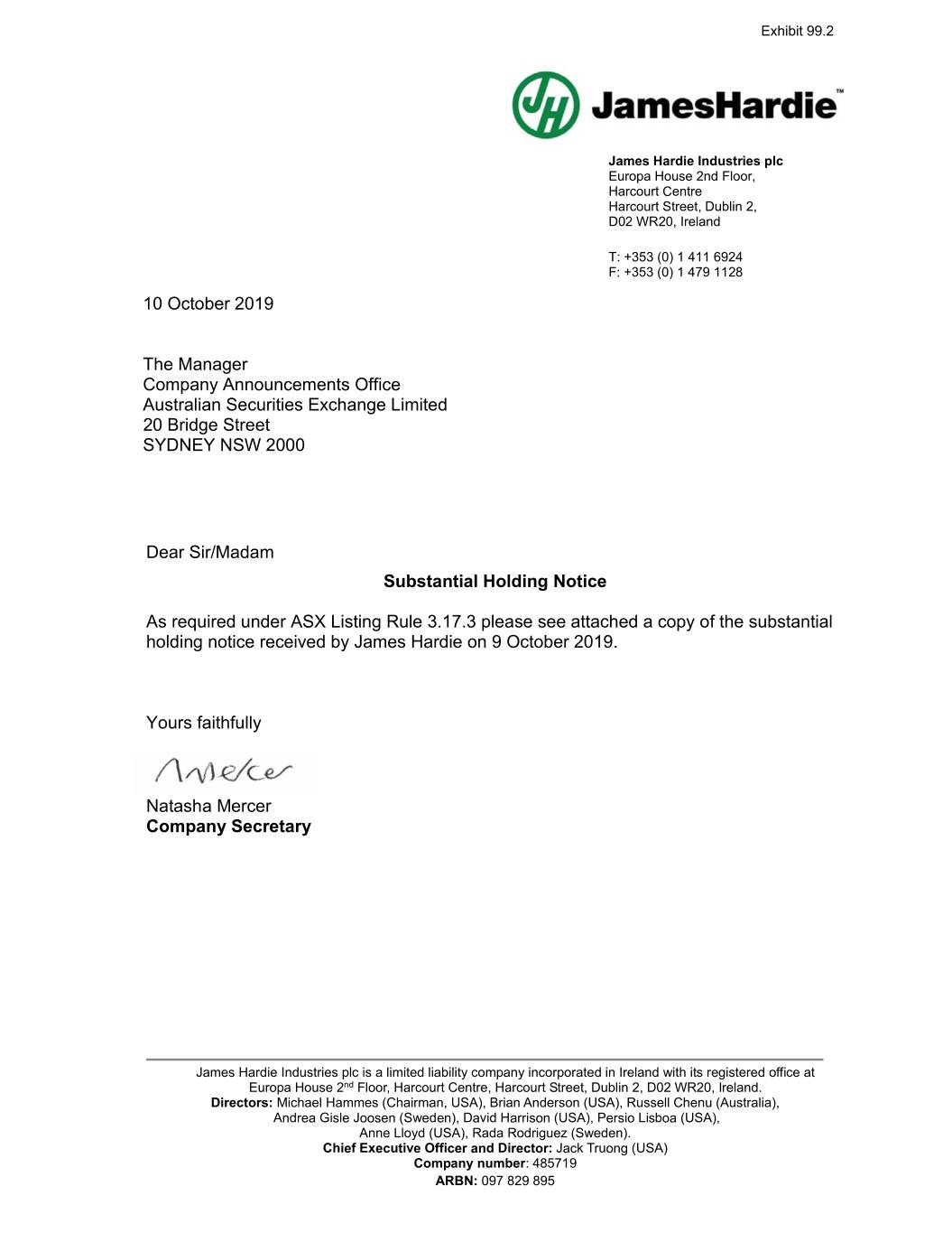 Exhibit 99.2 James Hardie Industries plc Europa House 2nd Floor, Harcourt Centre Harcourt Street, Dublin 2, D02 WR20, Ireland T: +353 (0) 1 411 6924 F: +353 (0) 1 479 1128 10 October 2019 The Manager Company Announcements Office Australian Securities Exchange Limited 20 Bridge Street SYDNEY NSW 2000 Dear Sir/Madam Substantial Holding Notice As required under ASX Listing Rule 3.17.3 please see attached a copy of the substantial holding notice received by James Hardie on 9 October 2019. Yours faithfully Natasha Mercer Company Secretary James Hardie Industries plc is a limited liability company incorporated in Ireland with its registered office at Europa House 2nd Floor, Harcourt Centre, Harcourt Street, Dublin 2, D02 WR20, Ireland. Directors: Michael Hammes (Chairman, USA), Brian Anderson (USA), Russell Chenu (Australia), Andrea Gisle Joosen (Sweden), David Harrison (USA), Persio Lisboa (USA), Anne Lloyd (USA), Rada Rodriguez (Sweden). Chief Executive Officer and Director: Jack Truong (USA) Company number: 485719 ARBN: 097 829 895