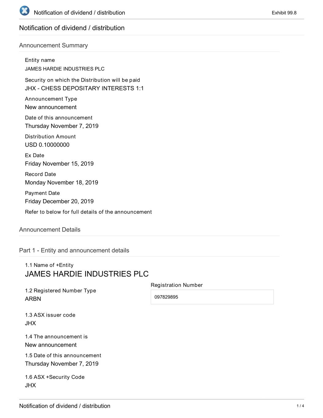 Notification of dividend / distribution Exhibit 99.8 Notification of dividend / distribution Announcement Summary Entity name JAMES HARDIE INDUSTRIES PLC Security on which the Distribution will be paid JHX - CHESS DEPOSITARY INTERESTS 1:1 Announcement Type New announcement Date of this announcement Thursday November 7, 2019 Distribution Amount USD 0.10000000 Ex Date Friday November 15, 2019 Record Date Monday November 18, 2019 Payment Date Friday December 20, 2019 Refer to below for full details of the announcement Announcement Details Part 1 - Entity and announcement details 1.1 Name of +Entity JAMES HARDIE INDUSTRIES PLC Registration Number 1.2 Registered Number Type ARBN 097829895 1.3 ASX issuer code JHX 1.4 The announcement is New announcement 1.5 Date of this announcement Thursday November 7, 2019 1.6 ASX +Security Code JHX Notification of dividend / distribution 1 / 4