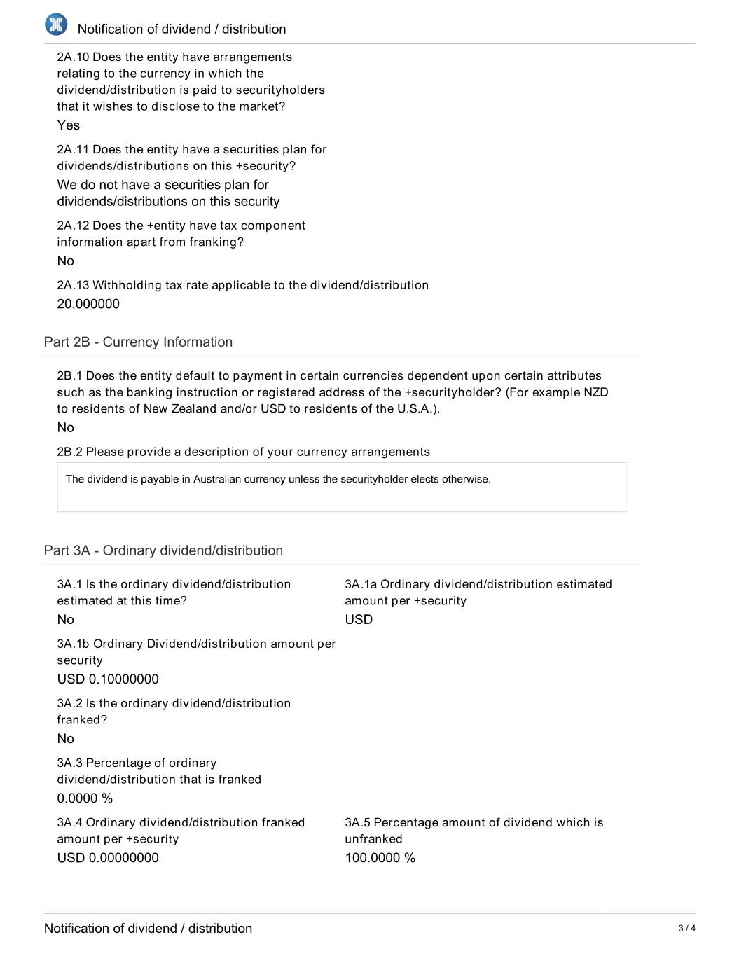 Notification of dividend / distribution 2A.10 Does the entity have arrangements relating to the currency in which the dividend/distribution is paid to securityholders that it wishes to disclose to the market? Yes 2A.11 Does the entity have a securities plan for dividends/distributions on this +security? We do not have a securities plan for dividends/distributions on this security 2A.12 Does the +entity have tax component information apart from franking? No 2A.13 Withholding tax rate applicable to the dividend/distribution 20.000000 Part 2B - Currency Information 2B.1 Does the entity default to payment in certain currencies dependent upon certain attributes such as the banking instruction or registered address of the +securityholder? (For example NZD to residents of New Zealand and/or USD to residents of the U.S.A.). No 2B.2 Please provide a description of your currency arrangements The dividend is payable in Australian currency unless the securityholder elects otherwise. Part 3A - Ordinary dividend/distribution 3A.1 Is the ordinary dividend/distribution 3A.1a Ordinary dividend/distribution estimated estimated at this time? amount per +security No USD 3A.1b Ordinary Dividend/distribution amount per security USD 0.10000000 3A.2 Is the ordinary dividend/distribution franked? No 3A.3 Percentage of ordinary dividend/distribution that is franked 0.0000 % 3A.4 Ordinary dividend/distribution franked 3A.5 Percentage amount of dividend which is amount per +security unfranked USD 0.00000000 100.0000 % Notification of dividend / distribution 3 / 4