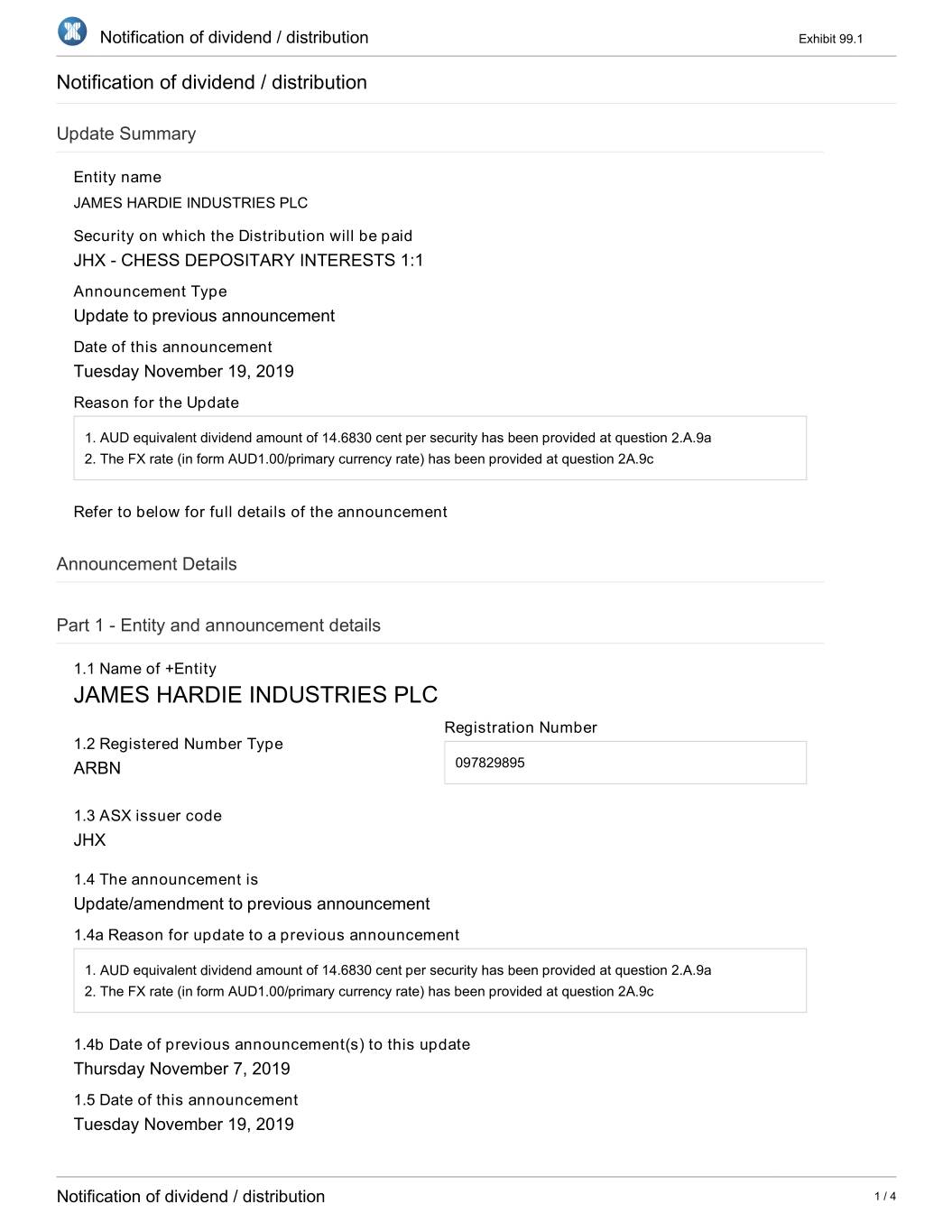 Notification of dividend / distribution Exhibit 99.1 Notification of dividend / distribution Update Summary Entity name JAMES HARDIE INDUSTRIES PLC Security on which the Distribution will be paid JHX - CHESS DEPOSITARY INTERESTS 1:1 Announcement Type Update to previous announcement Date of this announcement Tuesday November 19, 2019 Reason for the Update 1. AUD equivalent dividend amount of 14.6830 cent per security has been provided at question 2.A.9a 2. The FX rate (in form AUD1.00/primary currency rate) has been provided at question 2A.9c Refer to below for full details of the announcement Announcement Details Part 1 - Entity and announcement details 1.1 Name of +Entity JAMES HARDIE INDUSTRIES PLC Registration Number 1.2 Registered Number Type ARBN 097829895 1.3 ASX issuer code JHX 1.4 The announcement is Update/amendment to previous announcement 1.4a Reason for update to a previous announcement 1. AUD equivalent dividend amount of 14.6830 cent per security has been provided at question 2.A.9a 2. The FX rate (in form AUD1.00/primary currency rate) has been provided at question 2A.9c 1.4b Date of previous announcement(s) to this update Thursday November 7, 2019 1.5 Date of this announcement Tuesday November 19, 2019 Notification of dividend / distribution 1 / 4
