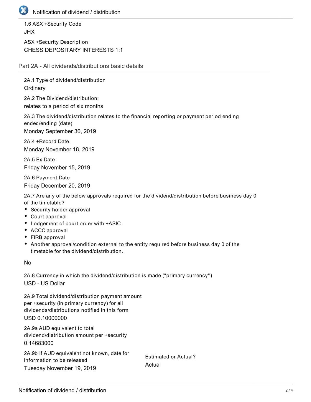 Notification of dividend / distribution 1.6 ASX +Security Code JHX ASX +Security Description CHESS DEPOSITARY INTERESTS 1:1 Part 2A - All dividends/distributions basic details 2A.1 Type of dividend/distribution Ordinary 2A.2 The Dividend/distribution: relates to a period of six months 2A.3 The dividend/distribution relates to the financial reporting or payment period ending ended/ending (date) Monday September 30, 2019 2A.4 +Record Date Monday November 18, 2019 2A.5 Ex Date Friday November 15, 2019 2A.6 Payment Date Friday December 20, 2019 2A.7 Are any of the below approvals required for the dividend/distribution before business day 0 of the timetable? Security holder approval Court approval Lodgement of court order with +ASIC ACCC approval FIRB approval Another approval/condition external to the entity required before business day 0 of the timetable for the dividend/distribution. No 2A.8 Currency in which the dividend/distribution is made ("primary currency") USD - US Dollar 2A.9 Total dividend/distribution payment amount per +security (in primary currency) for all dividends/distributions notified in this form USD 0.10000000 2A.9a AUD equivalent to total dividend/distribution amount per +security 0.14683000 2A.9b If AUD equivalent not known, date for Estimated or Actual? information to be released Actual Tuesday November 19, 2019 Notification of dividend / distribution 2 / 4