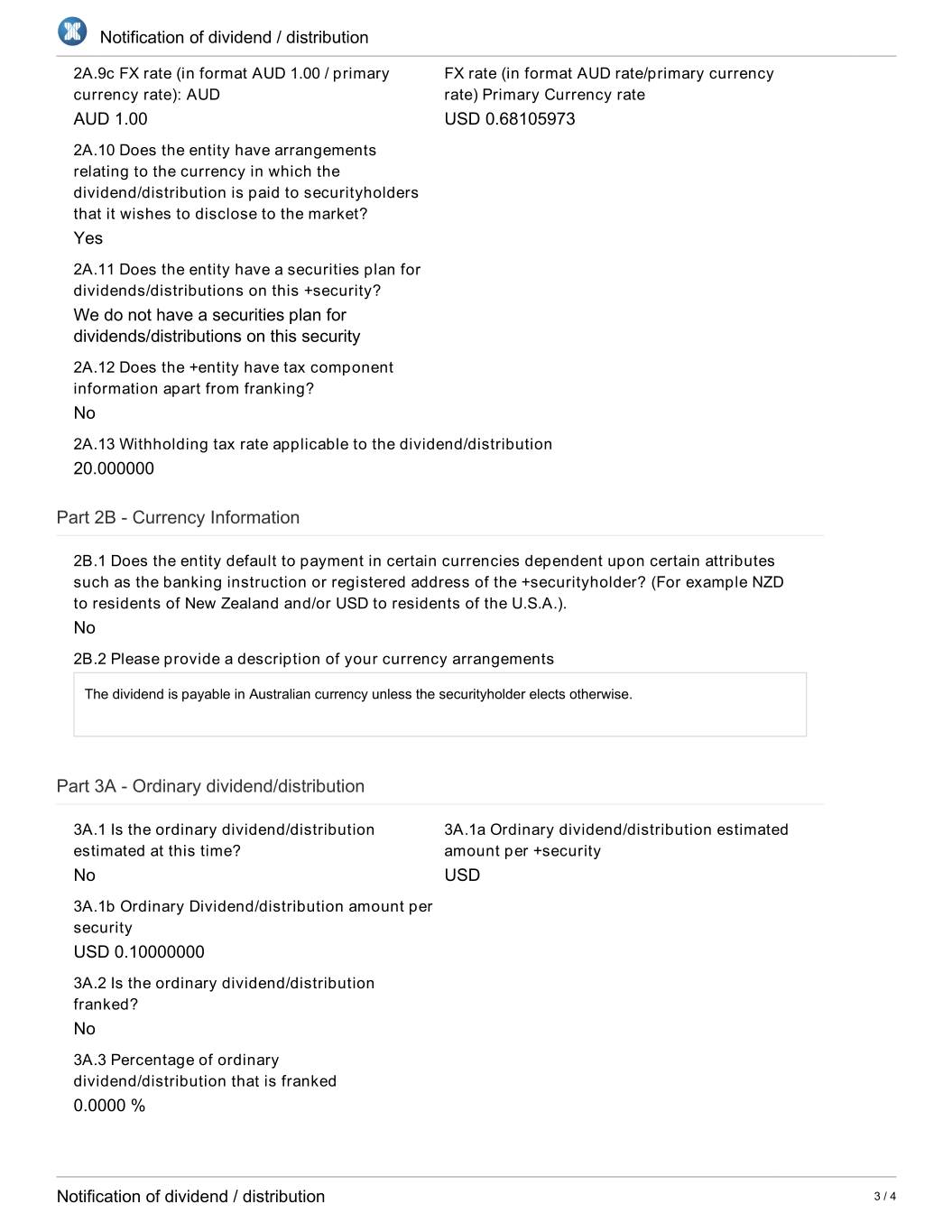 Notification of dividend / distribution 2A.9c FX rate (in format AUD 1.00 / primary FX rate (in format AUD rate/primary currency currency rate): AUD rate) Primary Currency rate AUD 1.00 USD 0.68105973 2A.10 Does the entity have arrangements relating to the currency in which the dividend/distribution is paid to securityholders that it wishes to disclose to the market? Yes 2A.11 Does the entity have a securities plan for dividends/distributions on this +security? We do not have a securities plan for dividends/distributions on this security 2A.12 Does the +entity have tax component information apart from franking? No 2A.13 Withholding tax rate applicable to the dividend/distribution 20.000000 Part 2B - Currency Information 2B.1 Does the entity default to payment in certain currencies dependent upon certain attributes such as the banking instruction or registered address of the +securityholder? (For example NZD to residents of New Zealand and/or USD to residents of the U.S.A.). No 2B.2 Please provide a description of your currency arrangements The dividend is payable in Australian currency unless the securityholder elects otherwise. Part 3A - Ordinary dividend/distribution 3A.1 Is the ordinary dividend/distribution 3A.1a Ordinary dividend/distribution estimated estimated at this time? amount per +security No USD 3A.1b Ordinary Dividend/distribution amount per security USD 0.10000000 3A.2 Is the ordinary dividend/distribution franked? No 3A.3 Percentage of ordinary dividend/distribution that is franked 0.0000 % Notification of dividend / distribution 3 / 4