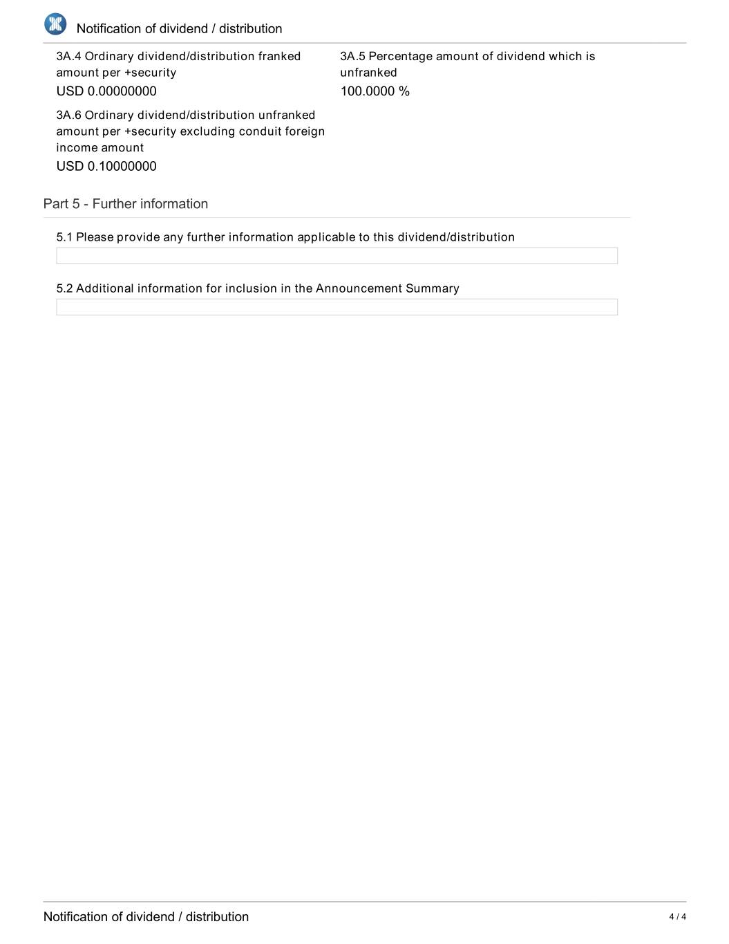 Notification of dividend / distribution 3A.4 Ordinary dividend/distribution franked 3A.5 Percentage amount of dividend which is amount per +security unfranked USD 0.00000000 100.0000 % 3A.6 Ordinary dividend/distribution unfranked amount per +security excluding conduit foreign income amount USD 0.10000000 Part 5 - Further information 5.1 Please provide any further information applicable to this dividend/distribution 5.2 Additional information for inclusion in the Announcement Summary Notification of dividend / distribution 4 / 4
