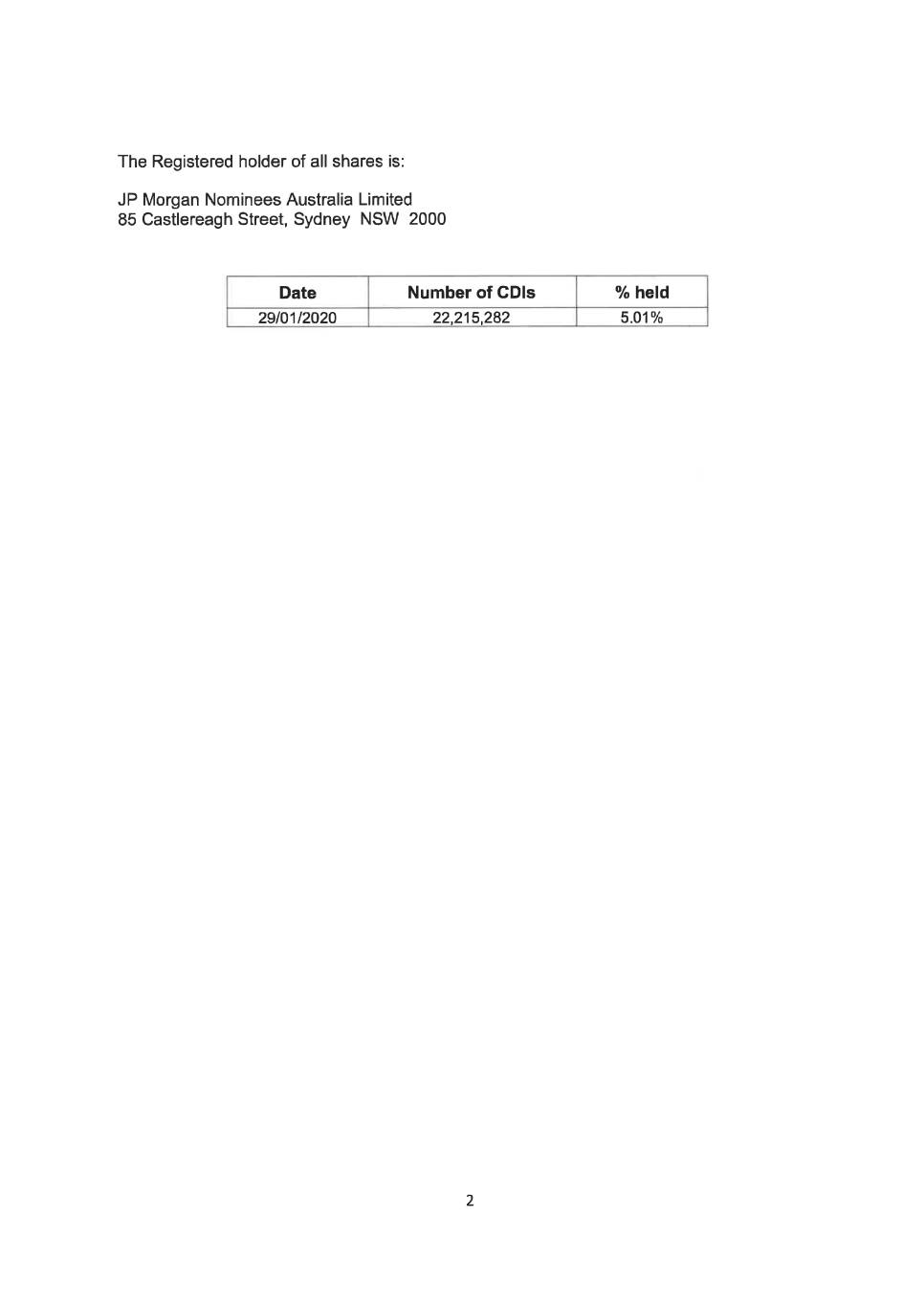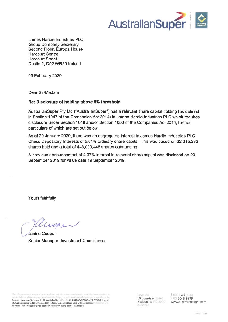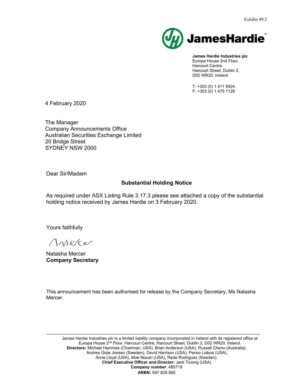 Exhibit 99.2 James Hardie Industries plc Europa House 2nd Floor, Harcourt Centre Harcourt Street, Dublin 2, D02 WR20, Ireland T: +353 (0) 1 411 6924 F: +353 (0) 1 479 1128 4 February 2020 The Manager Company Announcements Office Australian Securities Exchange Limited 20 Bridge Street SYDNEY NSW 2000 Dear Sir/Madam Substantial Holding Notice As required under ASX Listing Rule 3.17.3 please see attached a copy of the substantial holding notice received by James Hardie on 3 February 2020. Yours faithfully Natasha Mercer Company Secretary This announcement has been authorised for release by the Company Secretary, Ms Natasha Mercer. James Hardie Industries plc is a limited liability company incorporated in Ireland with its registered office at Europa House 2nd Floor, Harcourt Centre, Harcourt Street, Dublin 2, D02 WR20, Ireland. Directors: Michael Hammes (Chairman, USA), Brian Anderson (USA), Russell Chenu (Australia), Andrea Gisle Joosen (Sweden), David Harrison (USA), Persio Lisboa (USA), Anne Lloyd (USA), Moe Nozari (USA), Rada Rodriguez (Sweden). Chief Executive Officer and Director: Jack Truong (USA) Company number: 485719 ARBN: 097 829 895