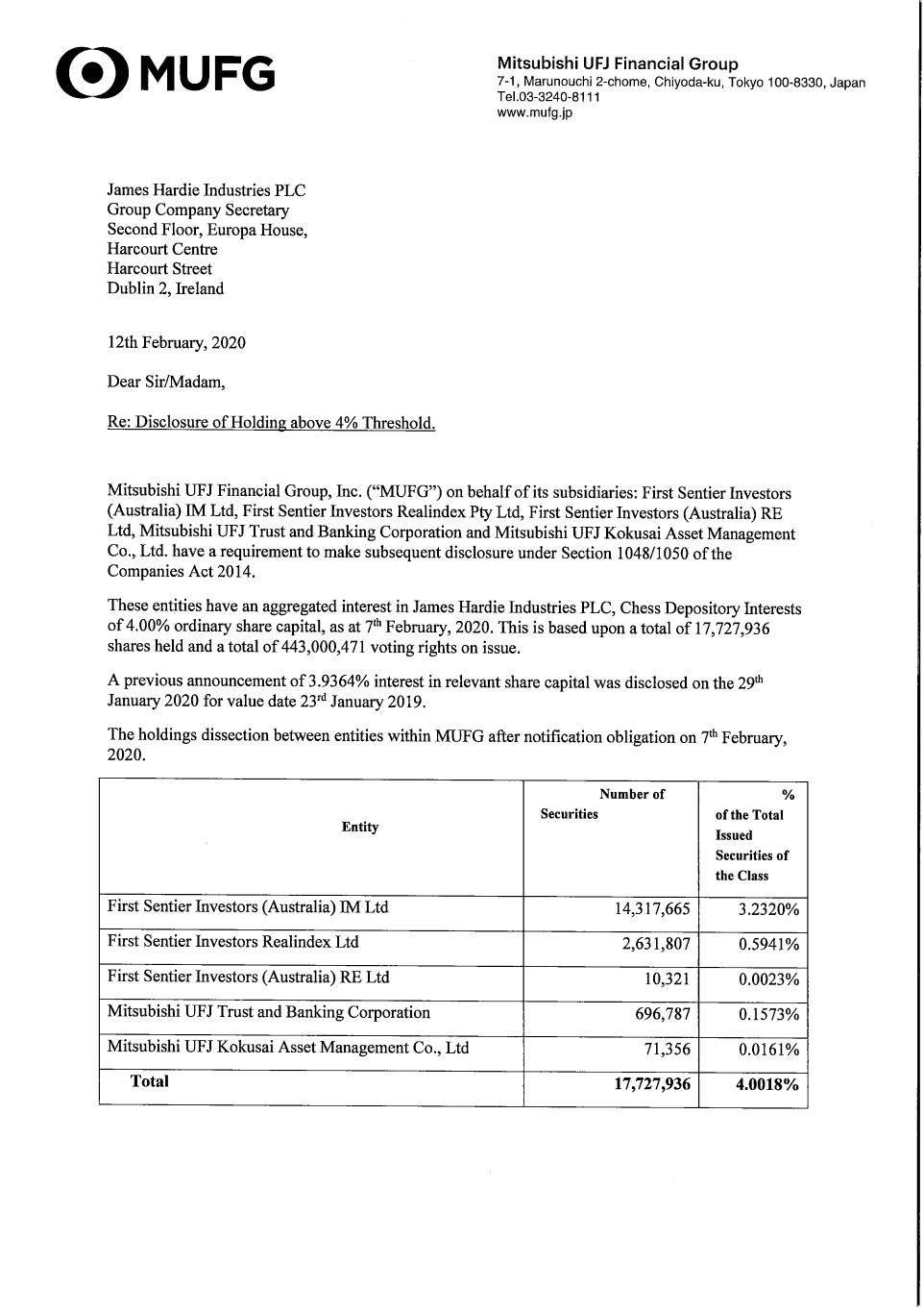 Exhibit 99.1 James Hardie Industries plc Europa House 2nd Floor, Harcourt Centre Harcourt Street, Dublin 2, D02 WR20, Ireland T: +353 (0) 1 411 6924 F: +353 (0) 1 479 1128 13 February 2020 The Manager Company Announcements Office Australian Securities Exchange Limited 20 Bridge Street SYDNEY NSW 2000 Dear Sir/Madam Substantial Holding Notice As required under ASX Listing Rule 3.17.3 please see attached a copy of the substantial holding notice received by James Hardie on 12 February 2020. Yours faithfully Natasha Mercer Company Secretary This announcement has been authorised for release by the Company Secretary, Ms Natasha Mercer. James Hardie Industries plc is a limited liability company incorporated in Ireland with its registered office at Europa House 2nd Floor, Harcourt Centre, Harcourt Street, Dublin 2, D02 WR20, Ireland. Directors: Michael Hammes (Chairman, USA), Brian Anderson (USA), Russell Chenu (Australia), Andrea Gisle Joosen (Sweden), David Harrison (USA), Persio Lisboa (USA), Anne Lloyd (USA), Moe Nozari (USA), Rada Rodriguez (Sweden). Chief Executive Officer and Director: Jack Truong (USA) Company number: 485719 ARBN: 097 829 895
