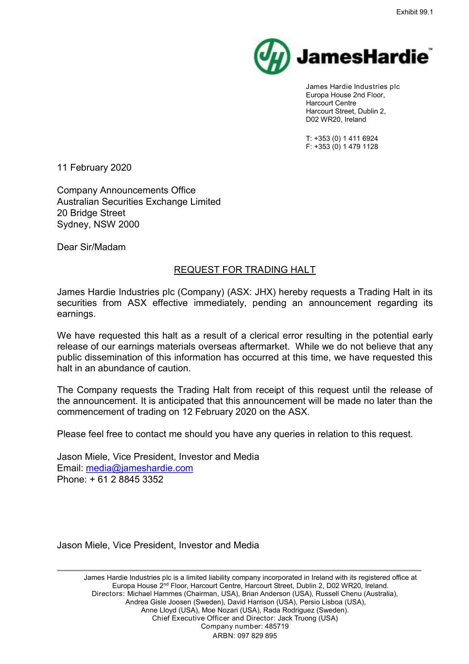 Exhibit 99.1 James Hardie Industries plc Europa House 2nd Floor, Harcourt Centre Harcourt Street, Dublin 2, D02 WR20, Ireland T: +353 (0) 1 411 6924 F: +353 (0) 1 479 1128 11 February 2020 Company Announcements Office Australian Securities Exchange Limited 20 Bridge Street Sydney, NSW 2000 Dear Sir/Madam REQUEST FOR TRADING HALT James Hardie Industries plc (Company) (ASX: JHX) hereby requests a Trading Halt in its securities from ASX effective immediately, pending an announcement regarding its earnings. We have requested this halt as a result of a clerical error resulting in the potential early release of our earnings materials overseas aftermarket. While we do not believe that any public dissemination of this information has occurred at this time, we have requested this halt in an abundance of caution. The Company requests the Trading Halt from receipt of this request until the release of the announcement. It is anticipated that this announcement will be made no later than the commencement of trading on 12 February 2020 on the ASX. Please feel free to contact me should you have any queries in relation to this request. Jason Miele, Vice President, Investor and Media Email: [email protected] Phone: + 61 2 8845 3352 Jason Miele, Vice President, Investor and Media James Hardie Industries plc is a limited liability company incorporated in Ireland with its registered office at Europa House 2nd Floor, Harcourt Centre, Harcourt Street, Dublin 2, D02 WR20, Ireland. Directors: Michael Hammes (Chairman, USA), Brian Anderson (USA), Russell Chenu (Australia), Andrea Gisle Joosen (Sweden), David Harrison (USA), Persio Lisboa (USA), Anne Lloyd (USA), Moe Nozari (USA), Rada Rodriguez (Sweden). Chief Executive Officer and Director: Jack Truong (USA) Company number: 485719 ARBN: 097 829 895