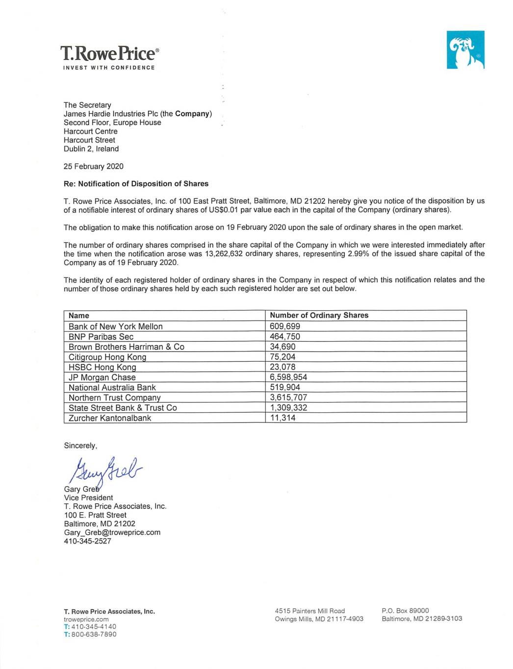 Exhibit 99.1 James Hardie Industries plc Europa House 2nd Floor, Harcourt Centre Harcourt Street, Dublin 2, D02 WR20, Ireland T: +353 (0) 1 411 6924 F: +353 (0) 1 479 1128 26 February 2020 The Manager Company Announcements Office Australian Securities Exchange Limited 20 Bridge Street SYDNEY NSW 2000 Dear Sir/Madam Substantial Holding Notice As required under ASX Listing Rule 3.17.3 please see attached a copy of the substantial holding notice received by James Hardie on 25 February 2020. Yours faithfully Natasha Mercer Company Secretary This announcement has been authorised for release by the Company Secretary, Ms Natasha Mercer. James Hardie Industries plc is a limited liability company incorporated in Ireland with its registered office at Europa House 2nd Floor, Harcourt Centre, Harcourt Street, Dublin 2, D02 WR20, Ireland. Directors: Michael Hammes (Chairman, USA), Brian Anderson (USA), Russell Chenu (Australia), Andrea Gisle Joosen (Sweden), David Harrison (USA), Persio Lisboa (USA), Anne Lloyd (USA), Moe Nozari (USA), Rada Rodriguez (Sweden). Chief Executive Officer and Director: Jack Truong (USA) Company number: 485719 ARBN: 097 829 895