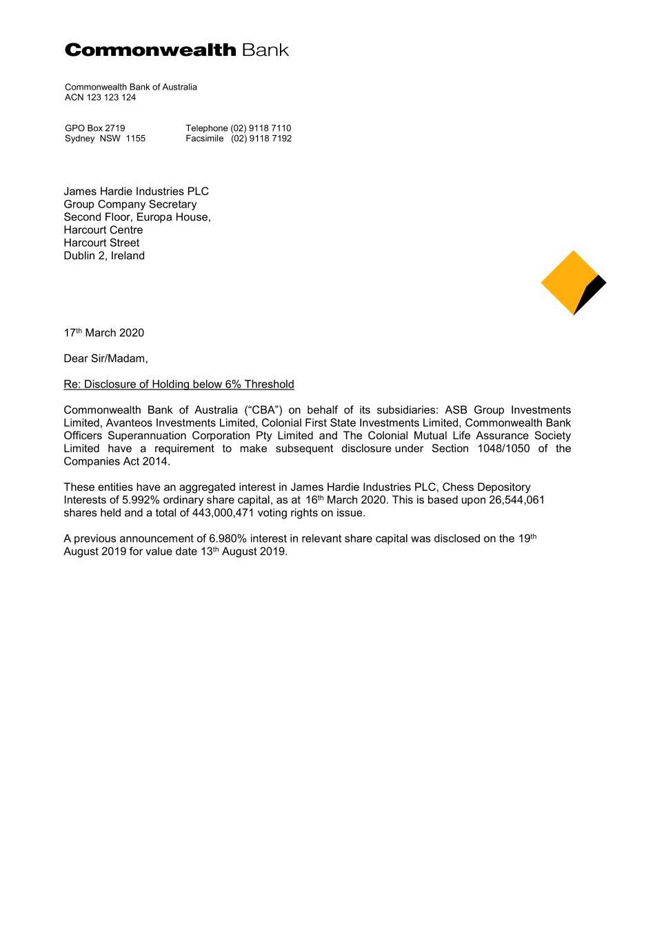 Commonwealth Bank of Australia ACN 123 123 124 GPO Box 2719 Telephone (02) 9118 7110 Sydney NSW 1155 Facsimile (02) 9118 7192 James Hardie Industries PLC Group Company Secretary Second Floor, Europa House, Harcourt Centre Harcourt Street Dublin 2, Ireland 17th March 2020 Dear Sir/Madam, Re: Disclosure of Holding below 6% Threshold Commonwealth Bank of Australia (“CBA”) on behalf of its subsidiaries: ASB Group Investments Limited, Avanteos Investments Limited, Colonial First State Investments Limited, Commonwealth Bank Officers Superannuation Corporation Pty Limited and The Colonial Mutual Life Assurance Society Limited have a requirement to make subsequent disclosure under Section 1048/1050 of the Companies Act 2014. These entities have an aggregated interest in James Hardie Industries PLC, Chess Depository Interests of 5.992% ordinary share capital, as at 16th March 2020. This is based upon 26,544,061 shares held and a total of 443,000,471 voting rights on issue. A previous announcement of 6.980% interest in relevant share capital was disclosed on the 19th August 2019 for value date 13th August 2019.