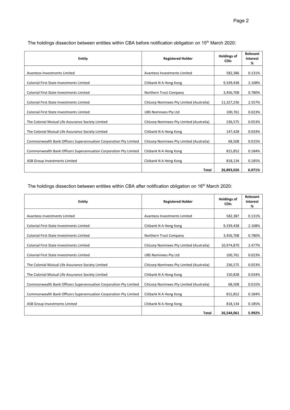 Page 2 The holdings dissection between entities within CBA before notification obligation on 15th March 2020: Relevant Holdings of Entity Registered Holder Interest CDIs % Avanteos Investments Limited Avanteos Investments Limited 582,386 0.131% Colonial First State Investments Limited Citibank N A Hong Kong 9,339,438 2.108% Colonial First State Investments Limited Northern Trust Company 3,456,708 0.780% Colonial First State Investments Limited Citicorp Nominees Pty Limited (Australia) 11,327,236 2.557% Colonial First State Investments Limited UBS Nominees Pty Ltd 100,761 0.023% The Colonial Mutual Life Assurance Society Limited Citicorp Nominees Pty Limited (Australia) 236,575 0.053% The Colonial Mutual Life Assurance Society Limited Citibank N A Hong Kong 147,428 0.033% Commonwealth Bank Officers Superannuation Corporation Pty Limited Citicorp Nominees Pty Limited (Australia) 68,508 0.015% Commonwealth Bank Officers Superannuation Corporation Pty Limited Citibank N A Hong Kong 815,852 0.184% ASB Group Investments Limited Citibank N A Hong Kong 818,134 0.185% Total 26,893,026 6.071% The holdings dissection between entities within CBA after notification obligation on 16th March 2020: Relevant Holdings of Entity Registered Holder Interest CDIs % Avanteos Investments Limited Avanteos Investments Limited 582,387 0.131% Colonial First State Investments Limited Citibank N A Hong Kong 9,339,438 2.108% Colonial First State Investments Limited Northern Trust Company 3,456,708 0.780% Colonial First State Investments Limited Citicorp Nominees Pty Limited (Australia) 10,974,870 2.477% Colonial First State Investments Limited UBS Nominees Pty Ltd 100,761 0.023% The Colonial Mutual Life Assurance Society Limited Citicorp Nominees Pty Limited (Australia) 236,575 0.053% The Colonial Mutual Life Assurance Society Limited Citibank N A Hong Kong 150,828 0.034% Commonwealth Bank Officers Superannuation Corporation Pty Limited Citicorp Nominees Pty Limited (Australia) 68,508 0.015% Commonwealth Bank Officers Superannuation Corporation Pty Limited Citibank N A Hong Kong 815,852 0.184% ASB Group Investments Limited Citibank N A Hong Kong 818,134 0.185% Total 26,544,061 5.992%
