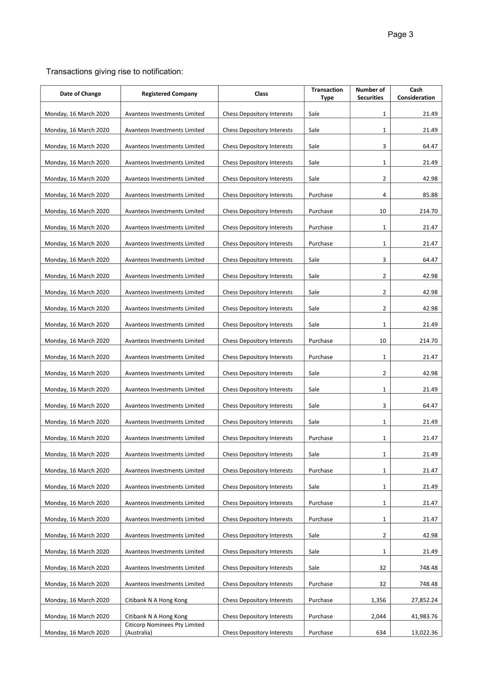 Page 3 Transactions giving rise to notification: Transaction Number of Cash Date of Change Registered Company Class Type Securities Consideration Monday, 16 March 2020 Avanteos Investments Limited Chess Depository Interests Sale 1 21.49 Monday, 16 March 2020 Avanteos Investments Limited Chess Depository Interests Sale 1 21.49 Monday, 16 March 2020 Avanteos Investments Limited Chess Depository Interests Sale 3 64.47 Monday, 16 March 2020 Avanteos Investments Limited Chess Depository Interests Sale 1 21.49 Monday, 16 March 2020 Avanteos Investments Limited Chess Depository Interests Sale 2 42.98 Monday, 16 March 2020 Avanteos Investments Limited Chess Depository Interests Purchase 4 85.88 Monday, 16 March 2020 Avanteos Investments Limited Chess Depository Interests Purchase 10 214.70 Monday, 16 March 2020 Avanteos Investments Limited Chess Depository Interests Purchase 1 21.47 Monday, 16 March 2020 Avanteos Investments Limited Chess Depository Interests Purchase 1 21.47 Monday, 16 March 2020 Avanteos Investments Limited Chess Depository Interests Sale 3 64.47 Monday, 16 March 2020 Avanteos Investments Limited Chess Depository Interests Sale 2 42.98 Monday, 16 March 2020 Avanteos Investments Limited Chess Depository Interests Sale 2 42.98 Monday, 16 March 2020 Avanteos Investments Limited Chess Depository Interests Sale 2 42.98 Monday, 16 March 2020 Avanteos Investments Limited Chess Depository Interests Sale 1 21.49 Monday, 16 March 2020 Avanteos Investments Limited Chess Depository Interests Purchase 10 214.70 Monday, 16 March 2020 Avanteos Investments Limited Chess Depository Interests Purchase 1 21.47 Monday, 16 March 2020 Avanteos Investments Limited Chess Depository Interests Sale 2 42.98 Monday, 16 March 2020 Avanteos Investments Limited Chess Depository Interests Sale 1 21.49 Monday, 16 March 2020 Avanteos Investments Limited Chess Depository Interests Sale 3 64.47 Monday, 16 March 2020 Avanteos Investments Limited Chess Depository Interests Sale 1 21.49 Monday, 16 March 2020 Avanteos Investments Limited Chess Depository Interests Purchase 1 21.47 Monday, 16 March 2020 Avanteos Investments Limited Chess Depository Interests Sale 1 21.49 Monday, 16 March 2020 Avanteos Investments Limited Chess Depository Interests Purchase 1 21.47 Monday, 16 March 2020 Avanteos Investments Limited Chess Depository Interests Sale 1 21.49 Monday, 16 March 2020 Avanteos Investments Limited Chess Depository Interests Purchase 1 21.47 Monday, 16 March 2020 Avanteos Investments Limited Chess Depository Interests Purchase 1 21.47 Monday, 16 March 2020 Avanteos Investments Limited Chess Depository Interests Sale 2 42.98 Monday, 16 March 2020 Avanteos Investments Limited Chess Depository Interests Sale 1 21.49 Monday, 16 March 2020 Avanteos Investments Limited Chess Depository Interests Sale 32 748.48 Monday, 16 March 2020 Avanteos Investments Limited Chess Depository Interests Purchase 32 748.48 Monday, 16 March 2020 Citibank N A Hong Kong Chess Depository Interests Purchase 1,356 27,852.24 Monday, 16 March 2020 Citibank N A Hong Kong Chess Depository Interests Purchase 2,044 41,983.76 Citicorp Nominees Pty Limited Monday, 16 March 2020 (Australia) Chess Depository Interests Purchase 634 13,022.36