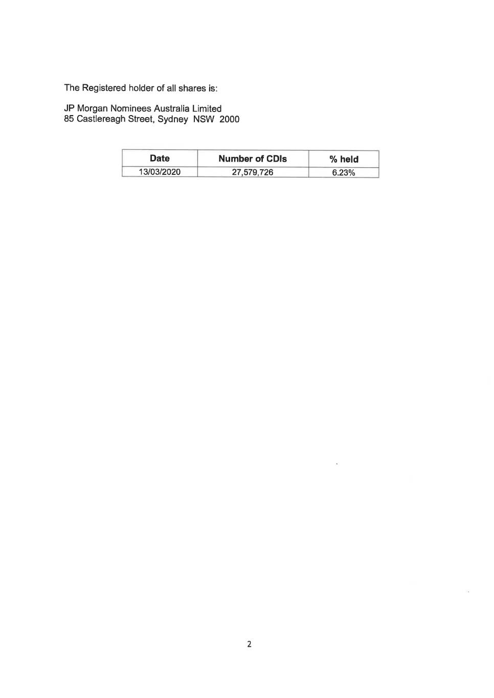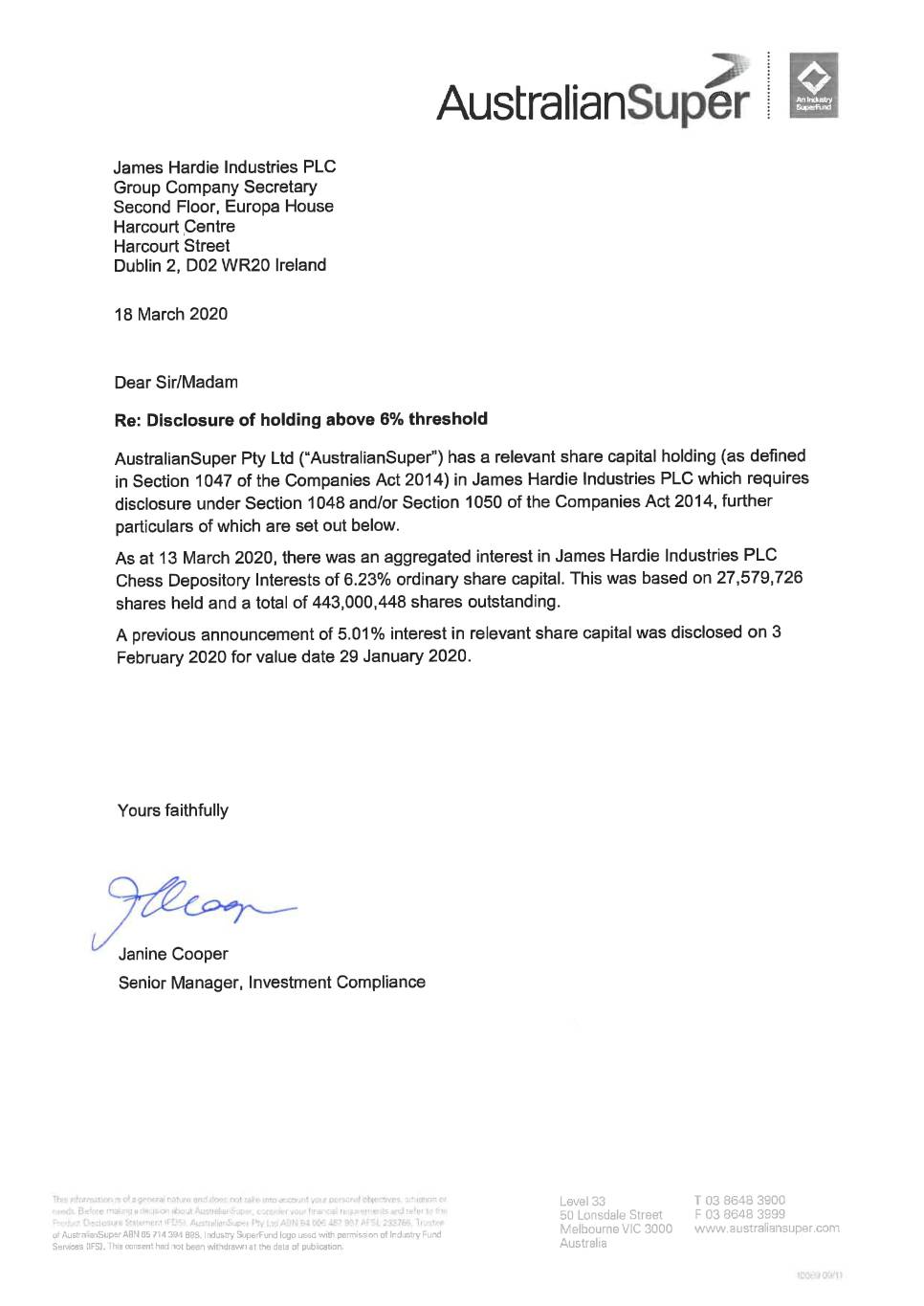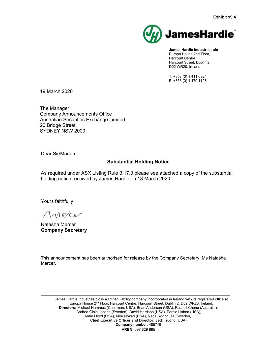 Exhibit 99.4 James Hardie Industries plc Europa House 2nd Floor, Harcourt Centre Harcourt Street, Dublin 2, D02 WR20, Ireland T: +353 (0) 1 411 6924 F: +353 (0) 1 479 1128 19 March 2020 The Manager Company Announcements Office Australian Securities Exchange Limited 20 Bridge Street SYDNEY NSW 2000 Dear Sir/Madam Substantial Holding Notice As required under ASX Listing Rule 3.17.3 please see attached a copy of the substantial holding notice received by James Hardie on 18 March 2020. Yours faithfully Natasha Mercer Company Secretary This announcement has been authorised for release by the Company Secretary, Ms Natasha Mercer. James Hardie Industries plc is a limited liability company incorporated in Ireland with its registered office at Europa House 2nd Floor, Harcourt Centre, Harcourt Street, Dublin 2, D02 WR20, Ireland. Directors: Michael Hammes (Chairman, USA), Brian Anderson (USA), Russell Chenu (Australia), Andrea Gisle Joosen (Sweden), David Harrison (USA), Persio Lisboa (USA), Anne Lloyd (USA), Moe Nozari (USA), Rada Rodriguez (Sweden). Chief Executive Officer and Director: Jack Truong (USA) Company number: 485719 ARBN: 097 829 895