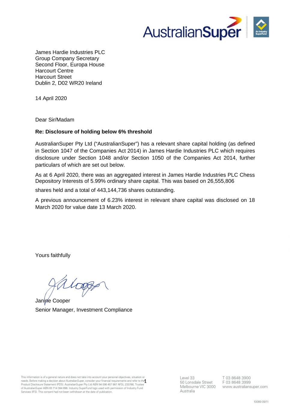 James Hardie Industries PLC Group Company Secretary Second Floor, Europa House Harcourt Centre Harcourt Street Dublin 2, D02 WR20 Ireland 14 April 2020 Dear Sir/Madam Re: Disclosure of holding below 6% threshold AustralianSuper Pty Ltd (“AustralianSuper”) has a relevant share capital holding (as defined in Section 1047 of the Companies Act 2014) in James Hardie Industries PLC which requires disclosure under Section 1048 and/or Section 1050 of the Companies Act 2014, further particulars of which are set out below. As at 6 April 2020, there was an aggregated interest in James Hardie Industries PLC Chess Depository Interests of 5.99% ordinary share capital. This was based on 26,555,806 shares held and a total of 443,144,736 shares outstanding. A previous announcement of 6.23% interest in relevant share capital was disclosed on 18 March 2020 for value date 13 March 2020. Yours faithfully Janine Cooper Senior Manager, Investment Compliance 1