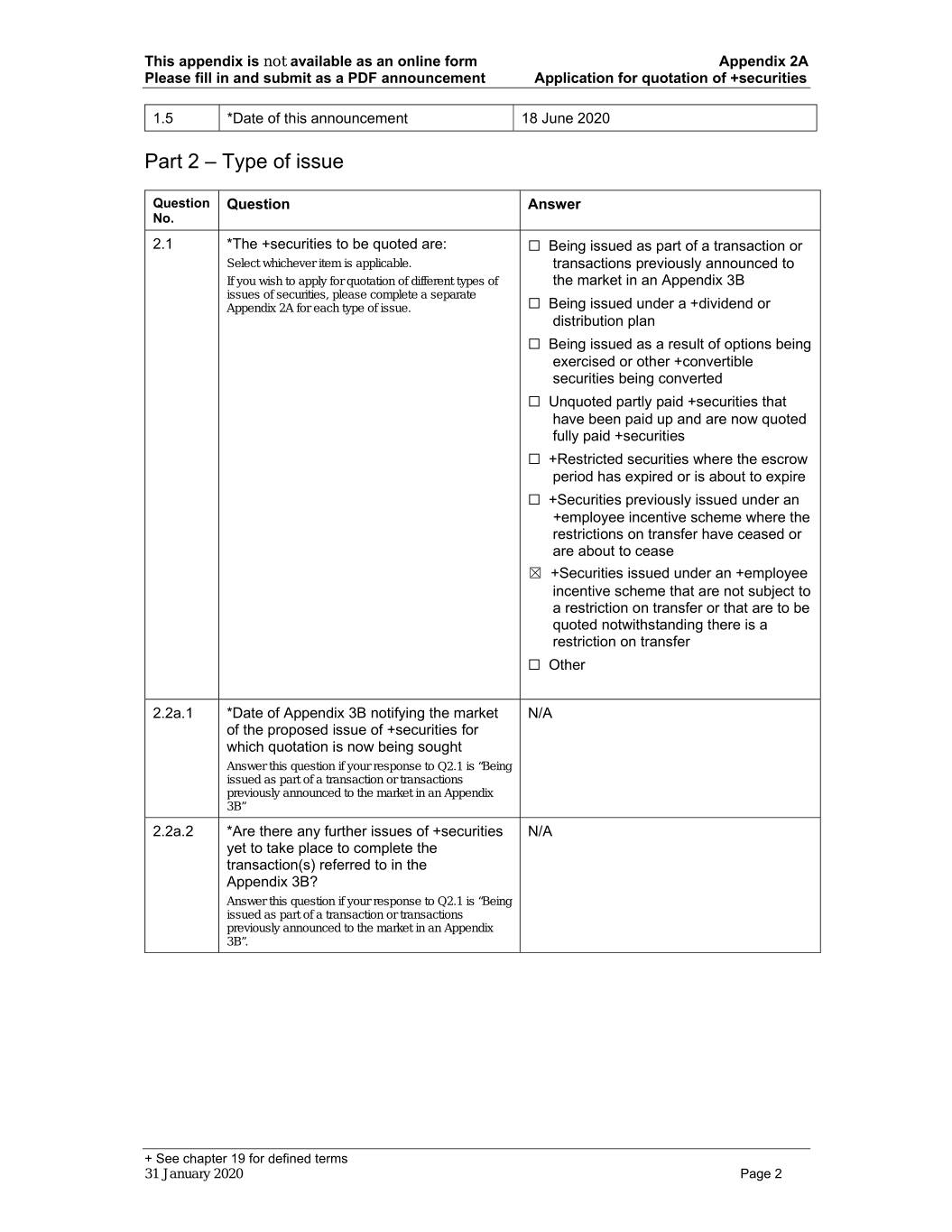 This appendix is not available as an online form Appendix 2A Please fill in and submit as a PDF announcement Application for quotation of +securities 1.5 *Date of this announcement 18 June 2020 Part 2 – Type of issue Question Question Answer No. 2.1 *The +securities to be quoted are: ☐ Being issued as part of a transaction or Select whichever item is applicable. transactions previously announced to If you wish to apply for quotation of different types of the market in an Appendix 3B issues of securities, please complete a separate Appendix 2A for each type of issue. ☐ Being issued under a +dividend or distribution plan ☐ Being issued as a result of options being exercised or other +convertible securities being converted ☐ Unquoted partly paid +securities that have been paid up and are now quoted fully paid +securities ☐ +Restricted securities where the escrow period has expired or is about to expire ☐ +Securities previously issued under an +employee incentive scheme where the restrictions on transfer have ceased or are about to cease ☒ +Securities issued under an +employee incentive scheme that are not subject to a restriction on transfer or that are to be quoted notwithstanding there is a restriction on transfer ☐ Other 2.2a.1 *Date of Appendix 3B notifying the market N/A of the proposed issue of +securities for which quotation is now being sought Answer this question if your response to Q2.1 is “Being issued as part of a transaction or transactions previously announced to the market in an Appendix 3B” 2.2a.2 *Are there any further issues of +securities N/A yet to take place to complete the transaction(s) referred to in the Appendix 3B? Answer this question if your response to Q2.1 is “Being issued as part of a transaction or transactions previously announced to the market in an Appendix 3B”. + See chapter 19 for defined terms 31 January 2020 Page 2