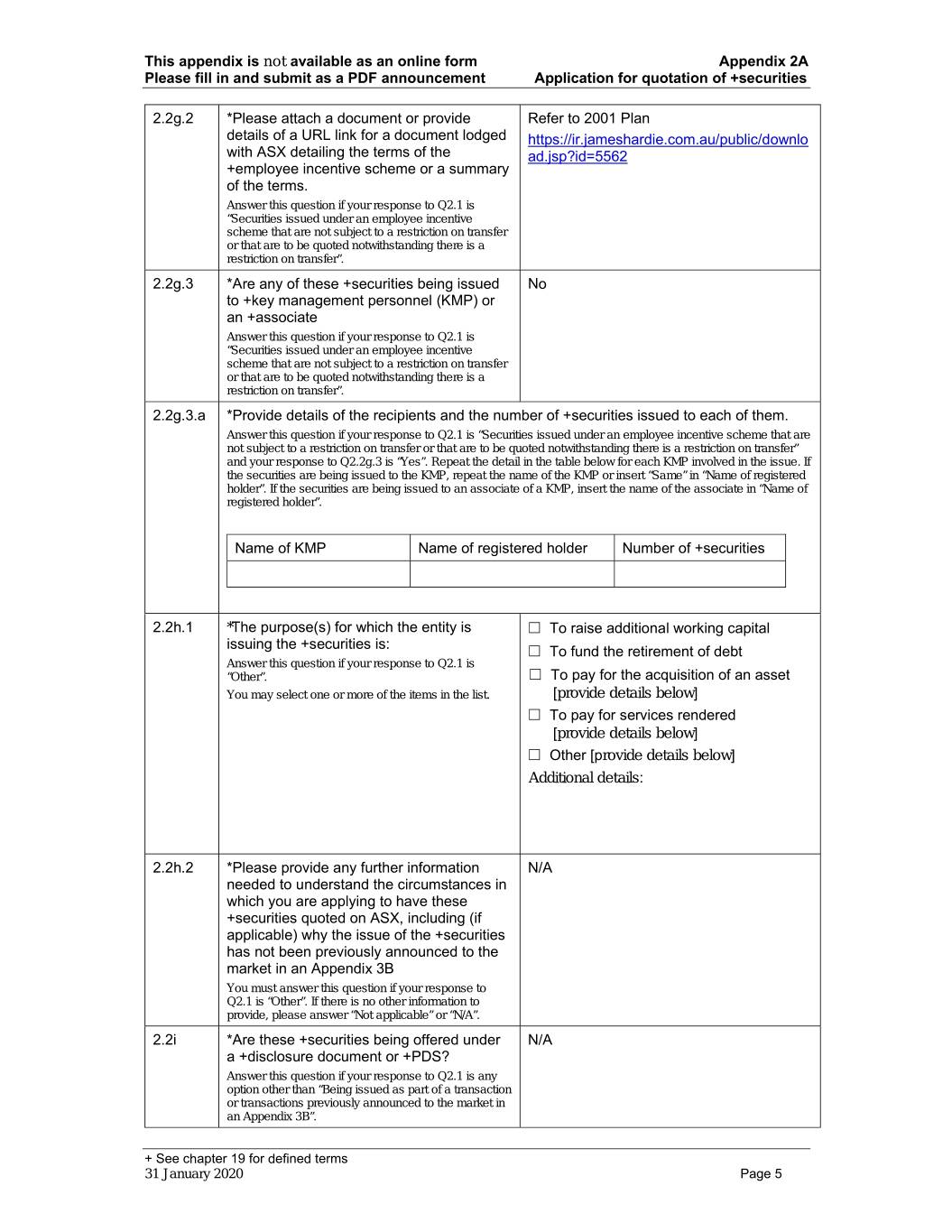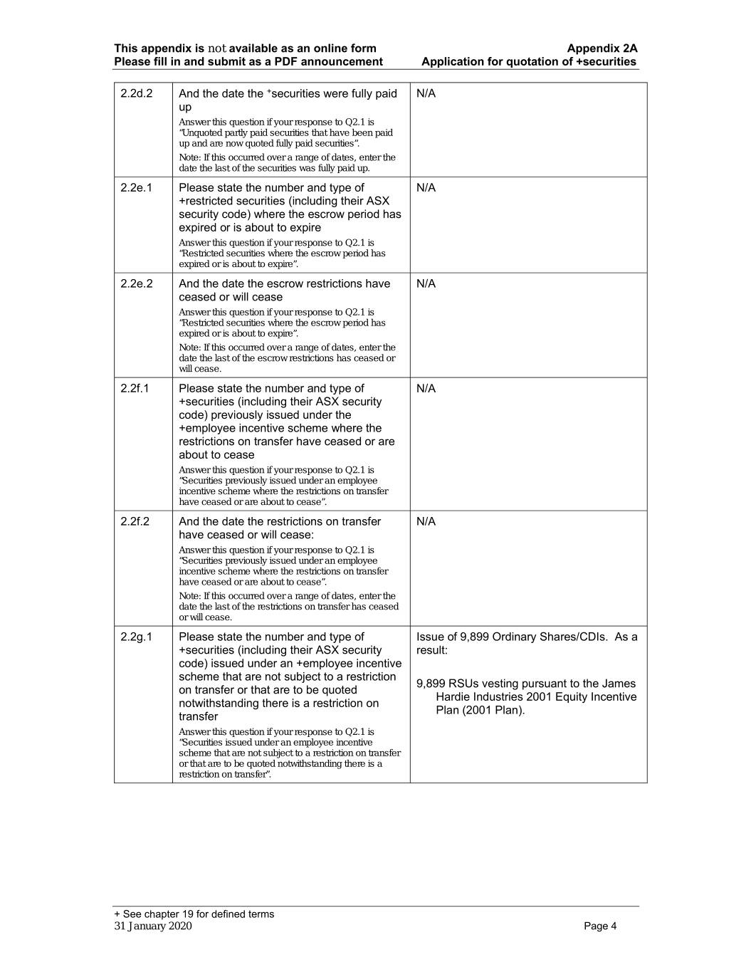 This appendix is not available as an online form Appendix 2A Please fill in and submit as a PDF announcement Application for quotation of +securities 2.2d.2 And the date the +securities were fully paid N/A up Answer this question if your response to Q2.1 is “Unquoted partly paid securities that have been paid up and are now quoted fully paid securities”. Note: If this occurred over a range of dates, enter the date the last of the securities was fully paid up. 2.2e.1 Please state the number and type of N/A +restricted securities (including their ASX security code) where the escrow period has expired or is about to expire Answer this question if your response to Q2.1 is “Restricted securities where the escrow period has expired or is about to expire”. 2.2e.2 And the date the escrow restrictions have N/A ceased or will cease Answer this question if your response to Q2.1 is “Restricted securities where the escrow period has expired or is about to expire”. Note: If this occurred over a range of dates, enter the date the last of the escrow restrictions has ceased or will cease. 2.2f.1 Please state the number and type of N/A +securities (including their ASX security code) previously issued under the +employee incentive scheme where the restrictions on transfer have ceased or are about to cease Answer this question if your response to Q2.1 is “Securities previously issued under an employee incentive scheme where the restrictions on transfer have ceased or are about to cease”. 2.2f.2 And the date the restrictions on transfer N/A have ceased or will cease: Answer this question if your response to Q2.1 is “Securities previously issued under an employee incentive scheme where the restrictions on transfer have ceased or are about to cease”. Note: If this occurred over a range of dates, enter the date the last of the restrictions on transfer has ceased or will cease. 2.2g.1 Please state the number and type of Issue of 9,899 Ordinary Shares/CDIs. As a +securities (including their ASX security result: code) issued under an +employee incentive scheme that are not subject to a restriction 9,899 RSUs vesting pursuant to the James on transfer or that are to be quoted Hardie Industries 2001 Equity Incentive notwithstanding there is a restriction on Plan (2001 Plan). transfer Answer this question if your response to Q2.1 is “Securities issued under an employee incentive scheme that are not subject to a restriction on transfer or that are to be quoted notwithstanding there is a restriction on transfer”. + See chapter 19 for defined terms 31 January 2020 Page 4