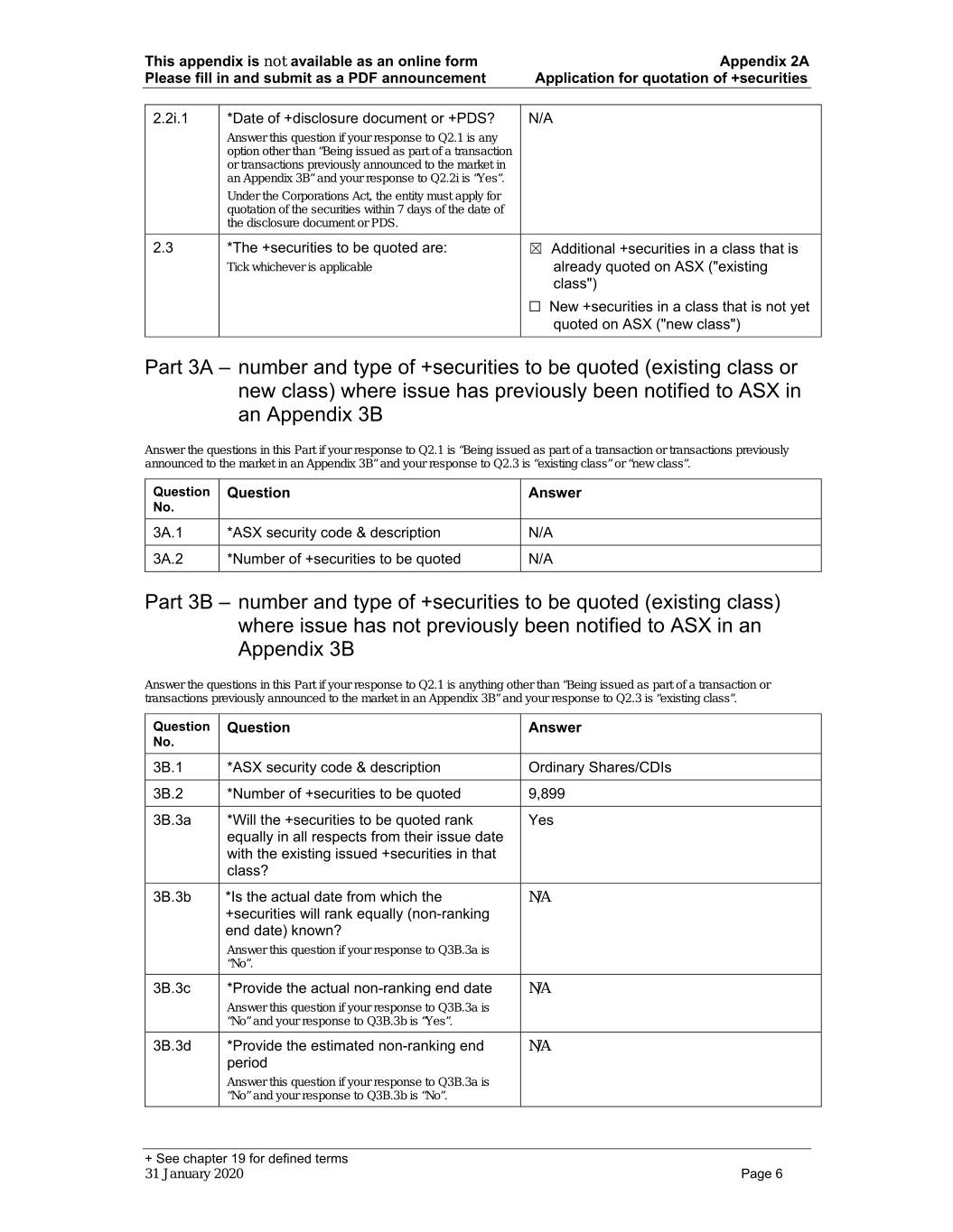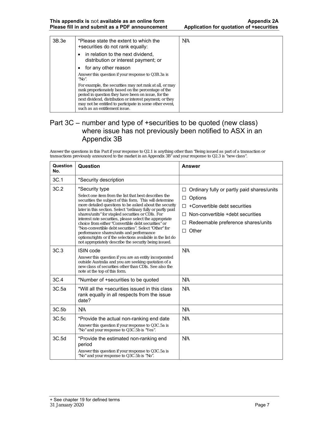 This appendix is not available as an online form Appendix 2A Please fill in and submit as a PDF announcement Application for quotation of +securities 3B.3e *Please state the extent to which the N/A +securities do not rank equally: in relation to the next dividend, distribution or interest payment; or for any other reason Answer this question if your response to Q3B.3a is “No”. For example, the securities may not rank at all, or may rank proportionately based on the percentage of the period in question they have been on issue, for the next dividend, distribution or interest payment; or they may not be entitled to participate in some other event, such as an entitlement issue. Part 3C – number and type of +securities to be quoted (new class) where issue has not previously been notified to ASX in an Appendix 3B Answer the questions in this Part if your response to Q2.1 is anything other than “Being issued as part of a transaction or transactions previously announced to the market in an Appendix 3B” and your response to Q2.3 is “new class”. Question Question Answer No. 3C.1 *Security description 3C.2 *Security type ☐ Ordinary fully or partly paid shares/units Select one item from the list that best describes the securities the subject of this form. This will determine ☐ Options more detailed questions to be asked about the security ☐ +Convertible debt securities later in this section. Select “ordinary fully or partly paid shares/units” for stapled securities or CDIs. For ☐ Non-convertible +debt securities interest rate securities, please select the appropriate choice from either “Convertible debt securities” or ☐ Redeemable preference shares/units “Non-convertible debt securities”. Select “Other” for performance shares/units and performance ☐ Other options/rights or if the selections available in the list do not appropriately describe the security being issued. 3C.3 ISIN code N/A Answer this question if you are an entity incorporated outside Australia and you are seeking quotation of a new class of securities other than CDIs. See also the note at the top of this form. 3C.4 *Number of +securities to be quoted N/A 3C.5a *Will all the +securities issued in this class N/A rank equally in all respects from the issue date? 3C.5b N/A N/A 3C.5c *Provide the actual non-ranking end date N/A Answer this question if your response to Q3C.5a is “No” and your response to Q3C.5b is “Yes”. 3C.5d *Provide the estimated non-ranking end N/A period Answer this question if your response to Q3C.5a is “No” and your response to Q3C.5b is “No”. + See chapter 19 for defined terms 31 January 2020 Page 7