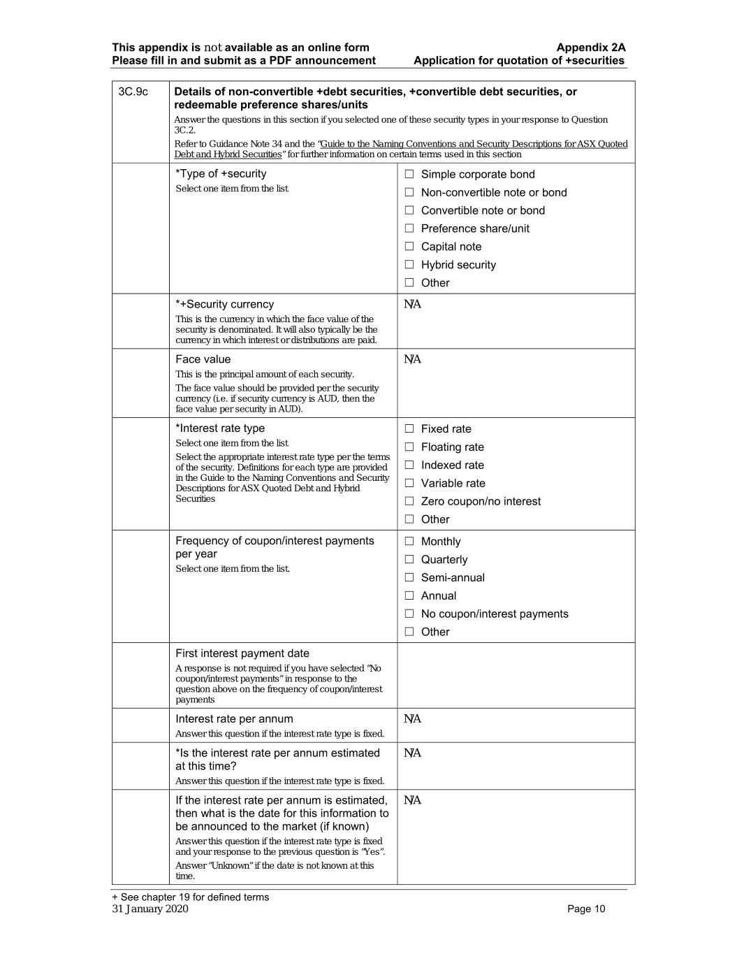 This appendix is not available as an online form Appendix 2A Please fill in and submit as a PDF announcement Application for quotation of +securities 3C.9c Details of non-convertible +debt securities, +convertible debt securities, or redeemable preference shares/units Answer the questions in this section if you selected one of these security types in your response to Question 3C.2. Refer to Guidance Note 34 and the “Guide to the Naming Conventions and Security Descriptions for ASX Quoted Debt and Hybrid Securities” for further information on certain terms used in this section *Type of +security ☐ Simple corporate bond Select one item from the list ☐ Non-convertible note or bond ☐ Convertible note or bond ☐ Preference share/unit ☐ Capital note ☐ Hybrid security ☐ Other *+Security currency N/A This is the currency in which the face value of the security is denominated. It will also typically be the currency in which interest or distributions are paid. Face value N/A This is the principal amount of each security. The face value should be provided per the security currency (i.e. if security currency is AUD, then the face value per security in AUD). *Interest rate type ☐ Fixed rate Select one item from the list ☐ Floating rate Select the appropriate interest rate type per the terms of the security. Definitions for each type are provided ☐ Indexed rate in the Guide to the Naming Conventions and Security ☐ Descriptions for ASX Quoted Debt and Hybrid Variable rate Securities ☐ Zero coupon/no interest ☐ Other Frequency of coupon/interest payments ☐ Monthly per year ☐ Quarterly Select one item from the list. ☐ Semi-annual ☐ Annual ☐ No coupon/interest payments ☐ Other First interest payment date A response is not required if you have selected “No coupon/interest payments” in response to the question above on the frequency of coupon/interest payments Interest rate per annum N/A Answer this question if the interest rate type is fixed. *Is the interest rate per annum estimated N/A at this time? Answer this question if the interest rate type is fixed. If the interest rate per annum is estimated, N/A then what is the date for this information to be announced to the market (if known) Answer this question if the interest rate type is fixed and your response to the previous question is “Yes”. Answer “Unknown” if the date is not known at this time. + See chapter 19 for defined terms 31 January 2020 Page 10