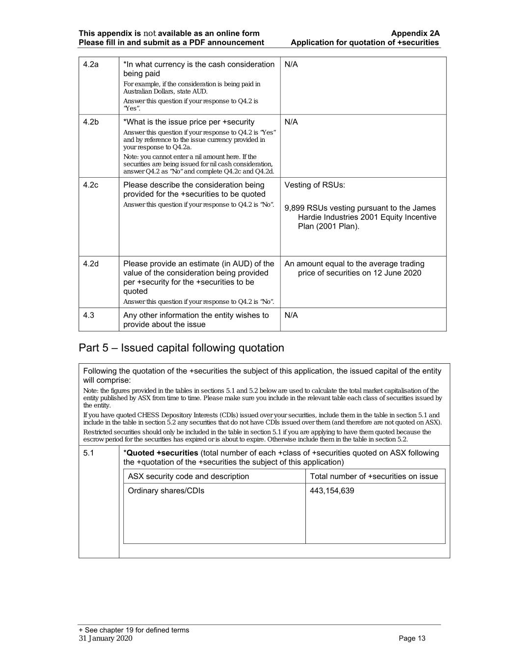 This appendix is not available as an online form Appendix 2A Please fill in and submit as a PDF announcement Application for quotation of +securities 4.2a *In what currency is the cash consideration N/A being paid For example, if the consideration is being paid in Australian Dollars, state AUD. Answer this question if your response to Q4.2 is “Yes”. 4.2b *What is the issue price per +security N/A Answer this question if your response to Q4.2 is “Yes” and by reference to the issue currency provided in your response to Q4.2a. Note: you cannot enter a nil amount here. If the securities are being issued for nil cash consideration, answer Q4.2 as “No” and complete Q4.2c and Q4.2d. 4.2c Please describe the consideration being Vesting of RSUs: provided for the +securities to be quoted Answer this question if your response to Q4.2 is “No”. 9,899 RSUs vesting pursuant to the James Hardie Industries 2001 Equity Incentive Plan (2001 Plan). 4.2d Please provide an estimate (in AUD) of the An amount equal to the average trading value of the consideration being provided price of securities on 12 June 2020 per +security for the +securities to be quoted Answer this question if your response to Q4.2 is “No”. 4.3 Any other information the entity wishes to N/A provide about the issue Part 5 – Issued capital following quotation Following the quotation of the +securities the subject of this application, the issued capital of the entity will comprise: Note: the figures provided in the tables in sections 5.1 and 5.2 below are used to calculate the total market capitalisation of the entity published by ASX from time to time. Please make sure you include in the relevant table each class of securities issued by the entity. If you have quoted CHESS Depository Interests (CDIs) issued over your securities, include them in the table in section 5.1 and include in the table in section 5.2 any securities that do not have CDIs issued over them (and therefore are not quoted on ASX). Restricted securities should only be included in the table in section 5.1 if you are applying to have them quoted because the escrow period for the securities has expired or is about to expire. Otherwise include them in the table in section 5.2. 5.1 *Quoted +securities (total number of each +class of +securities quoted on ASX following the +quotation of the +securities the subject of this application) ASX security code and description Total number of +securities on issue Ordinary shares/CDIs 443,154,639 + See chapter 19 for defined terms 31 January 2020 Page 13