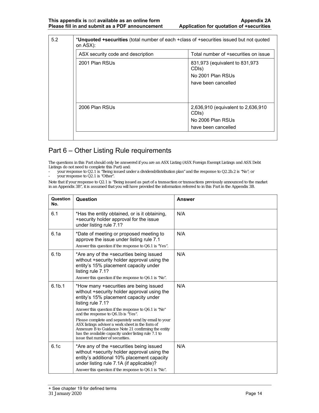 This appendix is not available as an online form Appendix 2A Please fill in and submit as a PDF announcement Application for quotation of +securities 5.2 *Unquoted +securities (total number of each +class of +securities issued but not quoted on ASX): ASX security code and description Total number of +securities on issue 2001 Plan RSUs 831,973 (equivalent to 831,973 CDIs) No 2001 Plan RSUs have been cancelled 2006 Plan RSUs 2,636,910 (equivalent to 2,636,910 CDIs) No 2006 Plan RSUs have been cancelled Part 6 – Other Listing Rule requirements The questions in this Part should only be answered if you are an ASX Listing (ASX Foreign Exempt Listings and ASX Debt Listings do not need to complete this Part) and: - your response to Q2.1 is “Being issued under a dividend/distribution plan” and the response to Q2.2b.2 is “No”; or - your response to Q2.1 is “Other”. Note that if your response to Q2.1 is “Being issued as part of a transaction or transactions previously announced to the market in an Appendix 3B”, it is assumed that you will have provided the information referred to in this Part in the Appendix 3B. Question Question Answer No. 6.1 *Has the entity obtained, or is it obtaining, N/A +security holder approval for the issue under listing rule 7.1? 6.1a *Date of meeting or proposed meeting to N/A approve the issue under listing rule 7.1 Answer this question if the response to Q6.1 is “Yes”. 6.1b *Are any of the +securities being issued N/A without +security holder approval using the entity’s 15% placement capacity under listing rule 7.1? Answer this question if the response to Q6.1 is “No”. 6.1b.1 *How many +securities are being issued N/A without +security holder approval using the entity’s 15% placement capacity under listing rule 7.1? Answer this question if the response to Q6.1 is “No” and the response to Q6.1b is “Yes”. Please complete and separately send by email to your ASX listings adviser a work sheet in the form of Annexure B to Guidance Note 21 confirming the entity has the available capacity under listing rule 7.1 to issue that number of securities. 6.1c *Are any of the +securities being issued N/A without +security holder approval using the entity’s additional 10% placement capacity under listing rule 7.1A (if applicable)? Answer this question if the response to Q6.1 is “No”. + See chapter 19 for defined terms 31 January 2020 Page 14