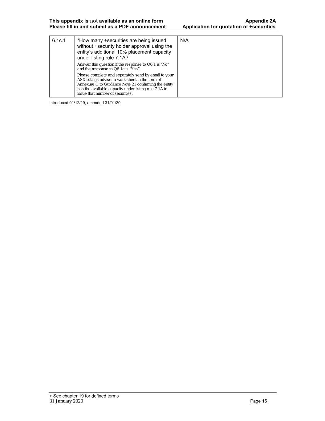 This appendix is not available as an online form Appendix 2A Please fill in and submit as a PDF announcement Application for quotation of +securities 6.1c.1 *How many +securities are being issued N/A without +security holder approval using the entity’s additional 10% placement capacity under listing rule 7.1A? Answer this question if the response to Q6.1 is “No” and the response to Q6.1c is “Yes”. Please complete and separately send by email to your ASX listings adviser a work sheet in the form of Annexure C to Guidance Note 21 confirming the entity has the available capacity under listing rule 7.1A to issue that number of securities. Introduced 01/12/19, amended 31/01/20 + See chapter 19 for defined terms 31 January 2020 Page 15