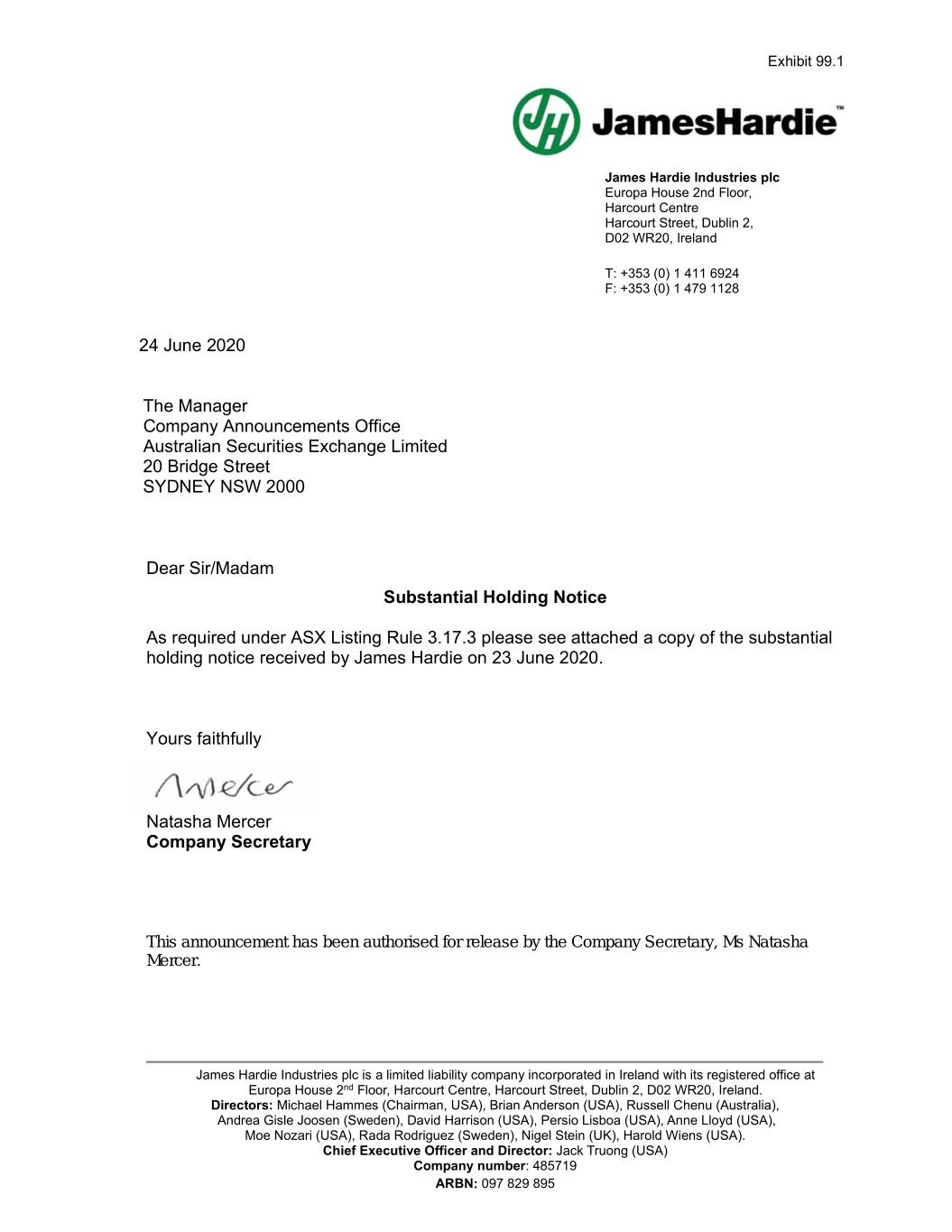 Exhibit 99.1 James Hardie Industries plc Europa House 2nd Floor, Harcourt Centre Harcourt Street, Dublin 2, D02 WR20, Ireland T: +353 (0) 1 411 6924 F: +353 (0) 1 479 1128 24 June 2020 The Manager Company Announcements Office Australian Securities Exchange Limited 20 Bridge Street SYDNEY NSW 2000 Dear Sir/Madam Substantial Holding Notice As required under ASX Listing Rule 3.17.3 please see attached a copy of the substantial holding notice received by James Hardie on 23 June 2020. Yours faithfully Natasha Mercer Company Secretary This announcement has been authorised for release by the Company Secretary, Ms Natasha Mercer. James Hardie Industries plc is a limited liability company incorporated in Ireland with its registered office at Europa House 2nd Floor, Harcourt Centre, Harcourt Street, Dublin 2, D02 WR20, Ireland. Directors: Michael Hammes (Chairman, USA), Brian Anderson (USA), Russell Chenu (Australia), Andrea Gisle Joosen (Sweden), David Harrison (USA), Persio Lisboa (USA), Anne Lloyd (USA), Moe Nozari (USA), Rada Rodriguez (Sweden), Nigel Stein (UK), Harold Wiens (USA). Chief Executive Officer and Director: Jack Truong (USA) Company number: 485719 ARBN: 097 829 895