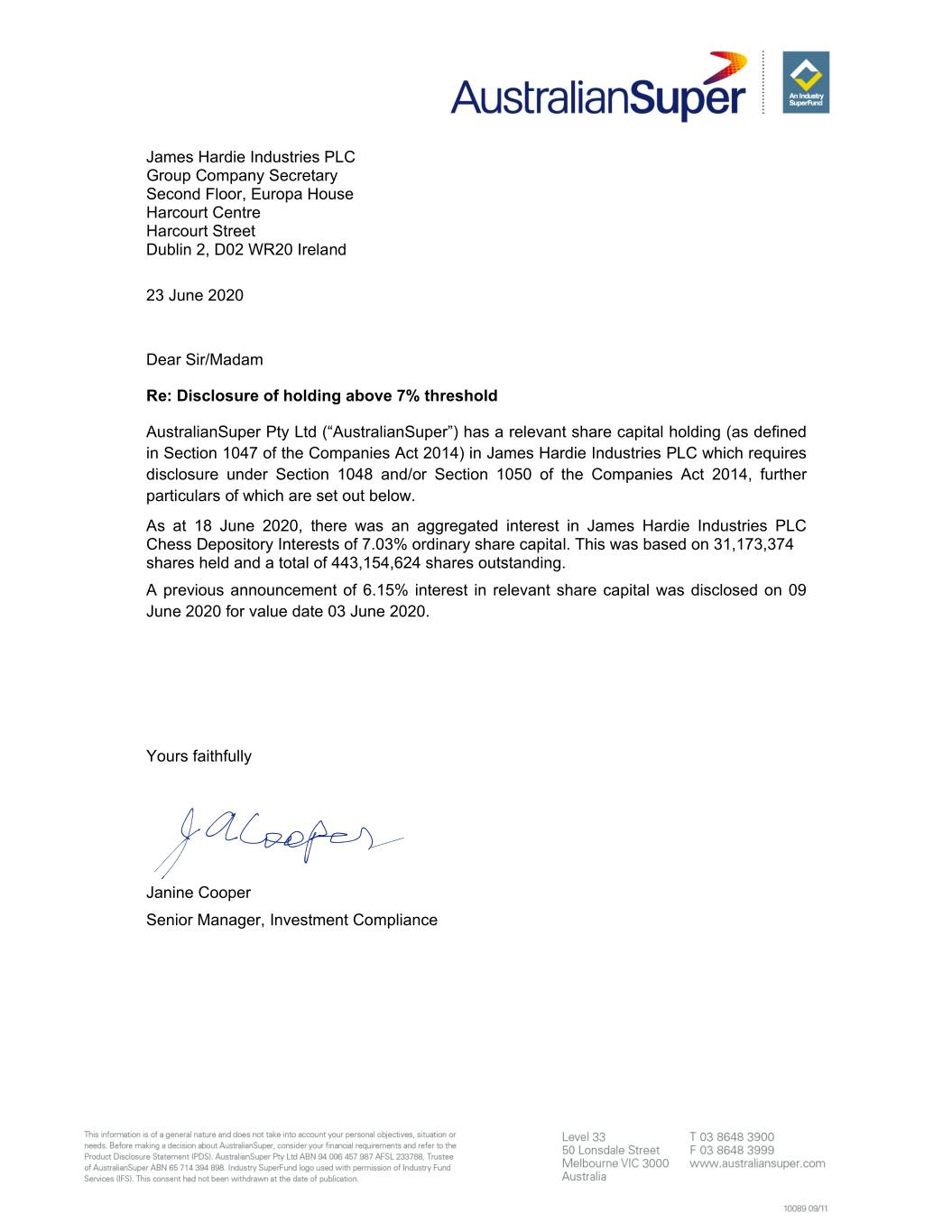 James Hardie Industries PLC Group Company Secretary Second Floor, Europa House Harcourt Centre Harcourt Street Dublin 2, D02 WR20 Ireland 23 June 2020 Dear Sir/Madam Re: Disclosure of holding above 7% threshold AustralianSuper Pty Ltd (“AustralianSuper”) has a relevant share capital holding (as defined in Section 1047 of the Companies Act 2014) in James Hardie Industries PLC which requires disclosure under Section 1048 and/or Section 1050 of the Companies Act 2014, further particulars of which are set out below. As at 18 June 2020, there was an aggregated interest in James Hardie Industries PLC Chess Depository Interests of 7.03% ordinary share capital. This was based on 31,173,374 shares held and a total of 443,154,624 shares outstanding. A previous announcement of 6.15% interest in relevant share capital was disclosed on 09 June 2020 for value date 03 June 2020. Yours faithfully Janine Cooper Senior Manager, Investment Compliance 1