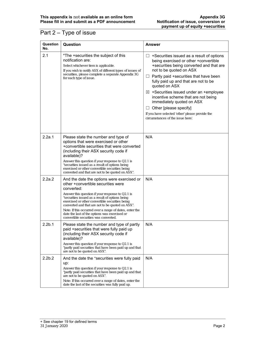This appendix is not available as an online form Appendix 3G Please fill in and submit as a PDF announcement Notification of issue, conversion or payment up of equity +securities Part 2 – Type of issue Question Question Answer No. 2.1 *The +securities the subject of this ☐ +Securities issued as a result of options notification are: being exercised or other +convertible Select whichever item is applicable. +securities being converted and that are If you wish to notify ASX of different types of issues of not to be quoted on ASX securities, please complete a separate Appendix 3G for each type of issue. ☐ Partly paid +securities that have been fully paid up and that are not to be quoted on ASX ☒ +Securities issued under an +employee incentive scheme that are not being immediately quoted on ASX ☐ Other [please specify] If you have selected ‘other’ please provide the circumstances of the issue here: 2.2a.1 Please state the number and type of N/A options that were exercised or other +convertible securities that were converted (including their ASX security code if available)? Answer this question if your response to Q2.1 is “securities issued as a result of options being exercised or other convertible securities being converted and that are not to be quoted on ASX”. 2.2a.2 And the date the options were exercised or N/A other +convertible securities were converted: Answer this question if your response to Q2.1 is “securities issued as a result of options being exercised or other convertible securities being converted and that are not to be quoted on ASX”. Note: If this occurred over a range of dates, enter the date the last of the options was exercised or convertible securities was converted. 2.2b.1 Please state the number and type of partly N/A paid +securities that were fully paid up (including their ASX security code if available)? Answer this question if your response to Q2.1 is “partly paid securities that have been paid up and that are not to be quoted on ASX”. 2.2b.2 And the date the +securities were fully paid N/A up: Answer this question if your response to Q2.1 is “partly paid securities that have been paid up and that are not to be quoted on ASX”. Note: If this occurred over a range of dates, enter the date the last of the securities was fully paid up. + See chapter 19 for defined terms 31 January 2020 Page 2