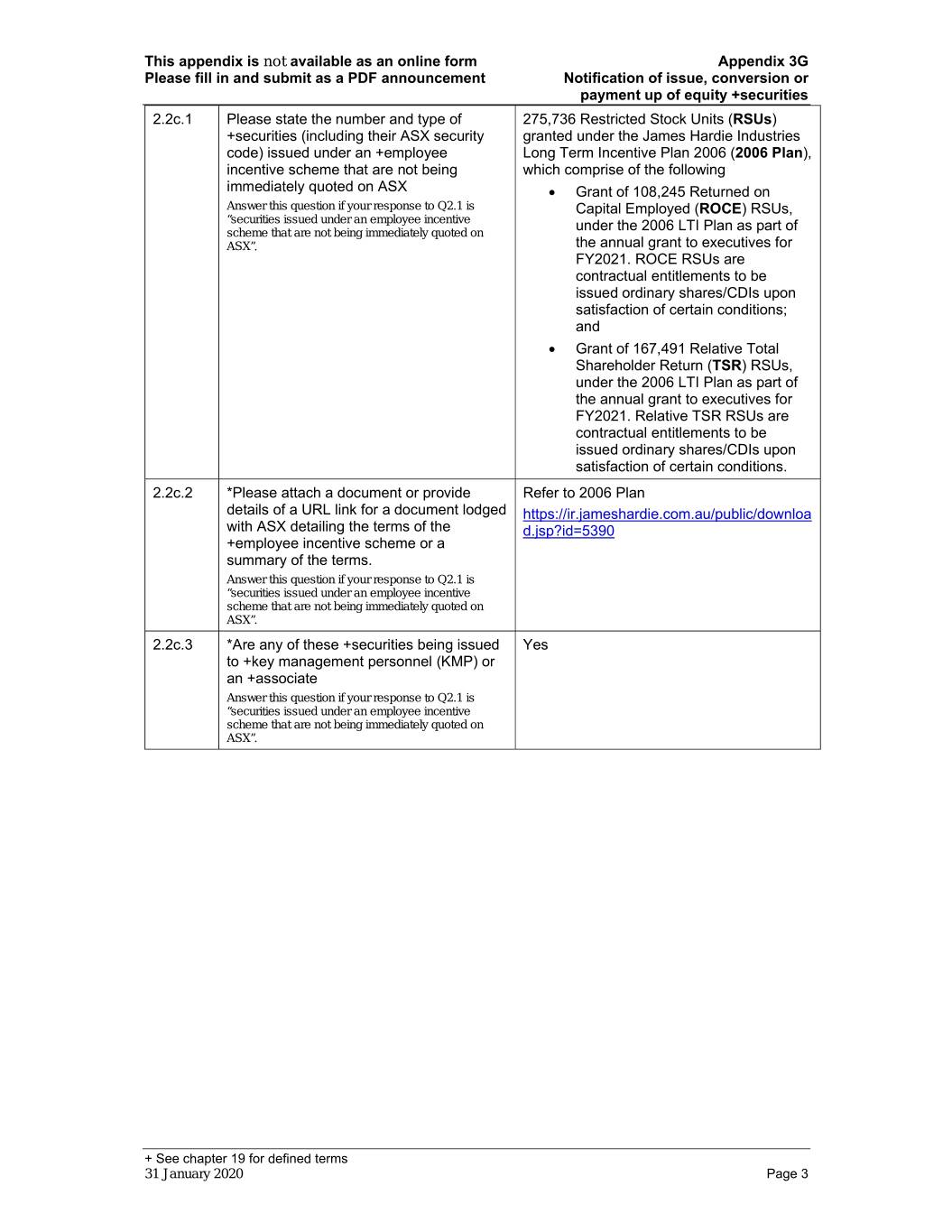 This appendix is not available as an online form Appendix 3G Please fill in and submit as a PDF announcement Notification of issue, conversion or payment up of equity +securities 2.2c.1 Please state the number and type of 275,736 Restricted Stock Units (RSUs) +securities (including their ASX security granted under the James Hardie Industries code) issued under an +employee Long Term Incentive Plan 2006 (2006 Plan), incentive scheme that are not being which comprise of the following immediately quoted on ASX Grant of 108,245 Returned on Answer this question if your response to Q2.1 is Capital Employed (ROCE) RSUs, “securities issued under an employee incentive scheme that are not being immediately quoted on under the 2006 LTI Plan as part of ASX”. the annual grant to executives for FY2021. ROCE RSUs are contractual entitlements to be issued ordinary shares/CDIs upon satisfaction of certain conditions; and Grant of 167,491 Relative Total Shareholder Return (TSR) RSUs, under the 2006 LTI Plan as part of the annual grant to executives for FY2021. Relative TSR RSUs are contractual entitlements to be issued ordinary shares/CDIs upon satisfaction of certain conditions. 2.2c.2 *Please attach a document or provide Refer to 2006 Plan details of a URL link for a document lodged https://ir.jameshardie.com.au/public/downloa with ASX detailing the terms of the d.jsp?id=5390 +employee incentive scheme or a summary of the terms. Answer this question if your response to Q2.1 is “securities issued under an employee incentive scheme that are not being immediately quoted on ASX”. 2.2c.3 *Are any of these +securities being issued Yes to +key management personnel (KMP) or an +associate Answer this question if your response to Q2.1 is “securities issued under an employee incentive scheme that are not being immediately quoted on ASX”. + See chapter 19 for defined terms 31 January 2020 Page 3