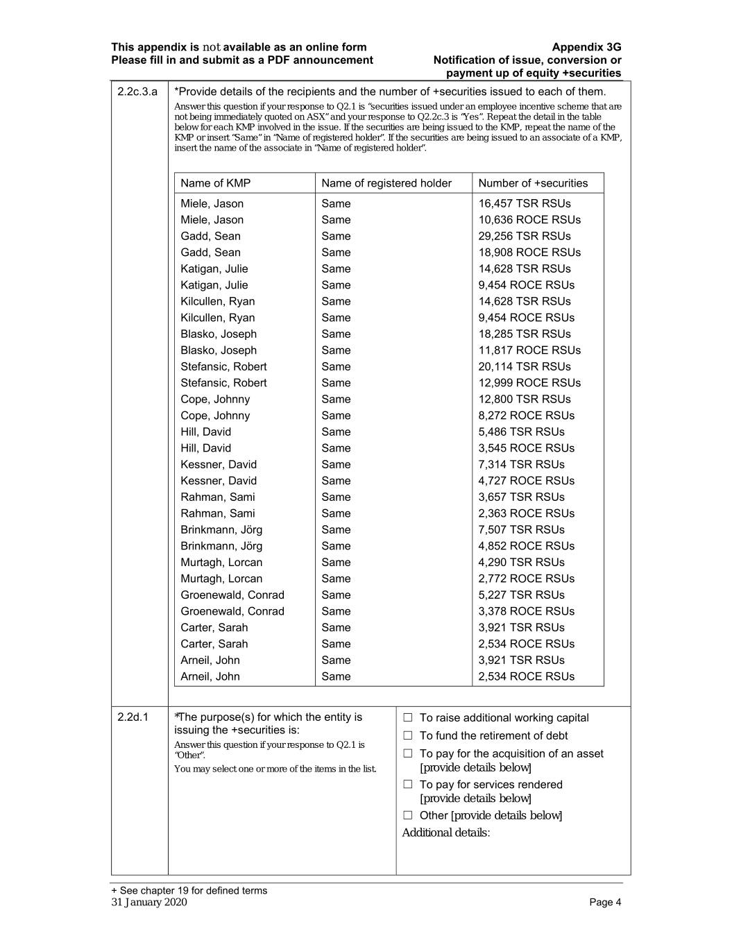 This appendix is not available as an online form Appendix 3G Please fill in and submit as a PDF announcement Notification of issue, conversion or payment up of equity +securities 2.2c.3.a *Provide details of the recipients and the number of +securities issued to each of them. Answer this question if your response to Q2.1 is “securities issued under an employee incentive scheme that are not being immediately quoted on ASX” and your response to Q2.2c.3 is “Yes”. Repeat the detail in the table below for each KMP involved in the issue. If the securities are being issued to the KMP, repeat the name of the KMP or insert “Same” in “Name of registered holder”. If the securities are being issued to an associate of a KMP, insert the name of the associate in “Name of registered holder”. Name of KMP Name of registered holder Number of +securities Miele, Jason Same 16,457 TSR RSUs Miele, Jason Same 10,636 ROCE RSUs Gadd, Sean Same 29,256 TSR RSUs Gadd, Sean Same 18,908 ROCE RSUs Katigan, Julie Same 14,628 TSR RSUs Katigan, Julie Same 9,454 ROCE RSUs Kilcullen, Ryan Same 14,628 TSR RSUs Kilcullen, Ryan Same 9,454 ROCE RSUs Blasko, Joseph Same 18,285 TSR RSUs Blasko, Joseph Same 11,817 ROCE RSUs Stefansic, Robert Same 20,114 TSR RSUs Stefansic, Robert Same 12,999 ROCE RSUs Cope, Johnny Same 12,800 TSR RSUs Cope, Johnny Same 8,272 ROCE RSUs Hill, David Same 5,486 TSR RSUs Hill, David Same 3,545 ROCE RSUs Kessner, David Same 7,314 TSR RSUs Kessner, David Same 4,727 ROCE RSUs Rahman, Sami Same 3,657 TSR RSUs Rahman, Sami Same 2,363 ROCE RSUs Brinkmann, Jӧrg Same 7,507 TSR RSUs Brinkmann, Jӧrg Same 4,852 ROCE RSUs Murtagh, Lorcan Same 4,290 TSR RSUs Murtagh, Lorcan Same 2,772 ROCE RSUs Groenewald, Conrad Same 5,227 TSR RSUs Groenewald, Conrad Same 3,378 ROCE RSUs Carter, Sarah Same 3,921 TSR RSUs Carter, Sarah Same 2,534 ROCE RSUs Arneil, John Same 3,921 TSR RSUs Arneil, John Same 2,534 ROCE RSUs 2.2d.1 *The purpose(s) for which the entity is ☐ To raise additional working capital issuing the +securities is: ☐ To fund the retirement of debt Answer this question if your response to Q2.1 is “Other”. ☐ To pay for the acquisition of an asset You may select one or more of the items in the list. [provide details below] ☐ To pay for services rendered [provide details below] ☐ Other [provide details below] Additional details: + See chapter 19 for defined terms 31 January 2020 Page 4