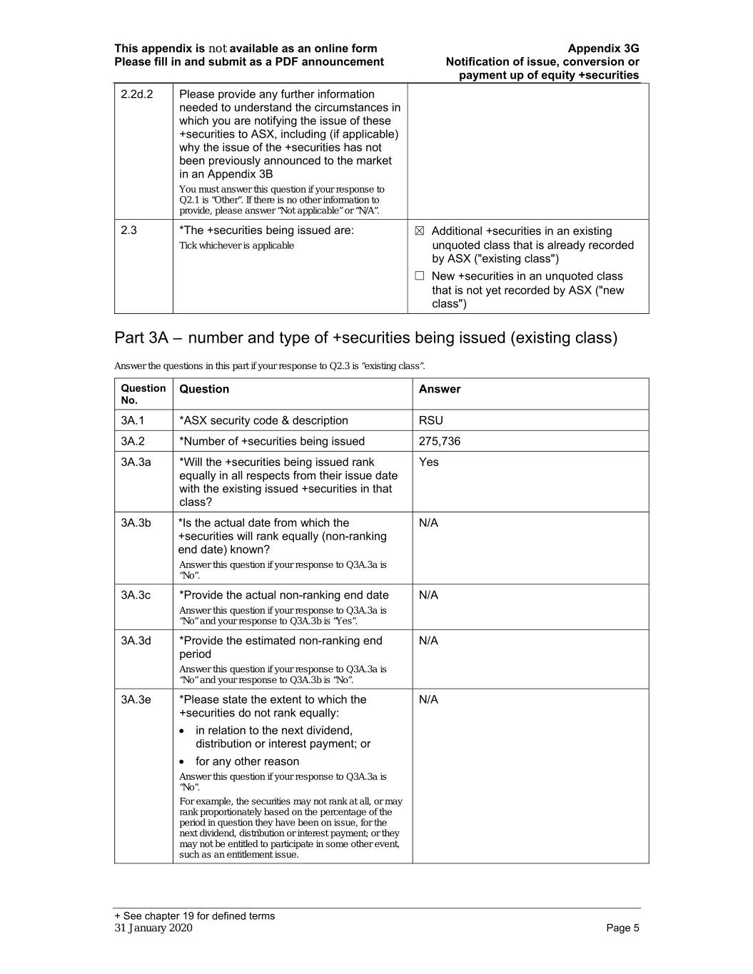 This appendix is not available as an online form Appendix 3G Please fill in and submit as a PDF announcement Notification of issue, conversion or payment up of equity +securities 2.2d.2 Please provide any further information needed to understand the circumstances in which you are notifying the issue of these +securities to ASX, including (if applicable) why the issue of the +securities has not been previously announced to the market in an Appendix 3B You must answer this question if your response to Q2.1 is “Other”. If there is no other information to provide, please answer “Not applicable” or “N/A”. 2.3 *The +securities being issued are: ☒ Additional +securities in an existing Tick whichever is applicable unquoted class that is already recorded by ASX ("existing class") ☐ New +securities in an unquoted class that is not yet recorded by ASX ("new class") Part 3A – number and type of +securities being issued (existing class) Answer the questions in this part if your response to Q2.3 is “existing class”. Question Question Answer No. 3A.1 *ASX security code & description RSU 3A.2 *Number of +securities being issued 275,736 3A.3a *Will the +securities being issued rank Yes equally in all respects from their issue date with the existing issued +securities in that class? 3A.3b *Is the actual date from which the N/A +securities will rank equally (non-ranking end date) known? Answer this question if your response to Q3A.3a is “No”. 3A.3c *Provide the actual non-ranking end date N/A Answer this question if your response to Q3A.3a is “No” and your response to Q3A.3b is “Yes”. 3A.3d *Provide the estimated non-ranking end N/A period Answer this question if your response to Q3A.3a is “No” and your response to Q3A.3b is “No”. 3A.3e *Please state the extent to which the N/A +securities do not rank equally: in relation to the next dividend, distribution or interest payment; or for any other reason Answer this question if your response to Q3A.3a is “No”. For example, the securities may not rank at all, or may rank proportionately based on the percentage of the period in question they have been on issue, for the next dividend, distribution or interest payment; or they may not be entitled to participate in some other event, such as an entitlement issue. + See chapter 19 for defined terms 31 January 2020 Page 5