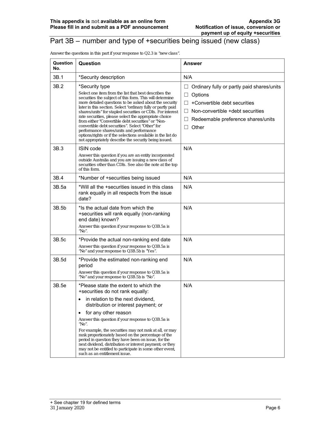 This appendix is not available as an online form Appendix 3G Please fill in and submit as a PDF announcement Notification of issue, conversion or payment up of equity +securities Part 3B – number and type of +securities being issued (new class) Answer the questions in this part if your response to Q2.3 is “new class”. Question Question Answer No. 3B.1 *Security description N/A 3B.2 *Security type ☐ Ordinary fully or partly paid shares/units Select one item from the list that best describes the ☐ Options securities the subject of this form. This will determine more detailed questions to be asked about the security ☐ +Convertible debt securities later in this section. Select “ordinary fully or partly paid shares/units” for stapled securities or CDIs. For interest ☐ Non-convertible +debt securities rate securities, please select the appropriate choice from either “Convertible debt securities” or “Non- ☐ Redeemable preference shares/units convertible debt securities”. Select “Other” for ☐ Other performance shares/units and performance options/rights or if the selections available in the list do not appropriately describe the security being issued. 3B.3 ISIN code N/A Answer this question if you are an entity incorporated outside Australia and you are issuing a new class of securities other than CDIs. See also the note at the top of this form. 3B.4 *Number of +securities being issued N/A 3B.5a *Will all the +securities issued in this class N/A rank equally in all respects from the issue date? 3B.5b *Is the actual date from which the N/A +securities will rank equally (non-ranking end date) known? Answer this question if your response to Q3B.5a is “No”. 3B.5c *Provide the actual non-ranking end date N/A Answer this question if your response to Q3B.5a is “No” and your response to Q3B.5b is “Yes”. 3B.5d *Provide the estimated non-ranking end N/A period Answer this question if your response to Q3B.5a is “No” and your response to Q3B.5b is “No”. 3B.5e *Please state the extent to which the N/A +securities do not rank equally: in relation to the next dividend, distribution or interest payment; or for any other reason Answer this question if your response to Q3B.5a is “No”. For example, the securities may not rank at all, or may rank proportionately based on the percentage of the period in question they have been on issue, for the next dividend, distribution or interest payment; or they may not be entitled to participate in some other event, such as an entitlement issue. + See chapter 19 for defined terms 31 January 2020 Page 6