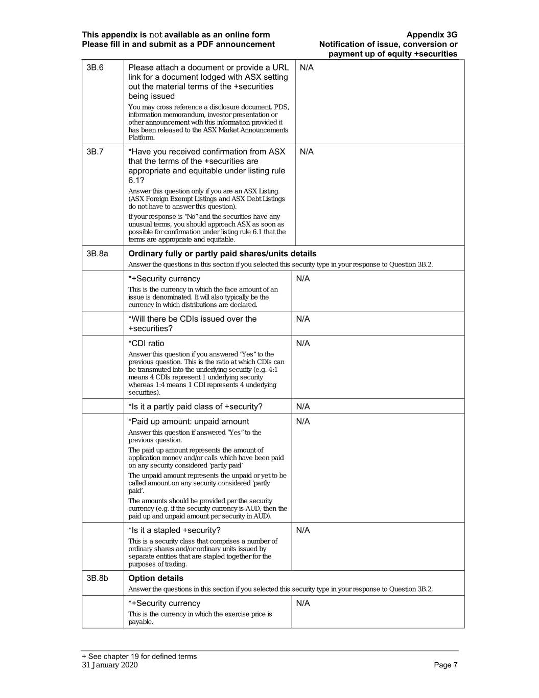 This appendix is not available as an online form Appendix 3G Please fill in and submit as a PDF announcement Notification of issue, conversion or payment up of equity +securities 3B.6 Please attach a document or provide a URL N/A link for a document lodged with ASX setting out the material terms of the +securities being issued You may cross reference a disclosure document, PDS, information memorandum, investor presentation or other announcement with this information provided it has been released to the ASX Market Announcements Platform. 3B.7 *Have you received confirmation from ASX N/A that the terms of the +securities are appropriate and equitable under listing rule 6.1? Answer this question only if you are an ASX Listing. (ASX Foreign Exempt Listings and ASX Debt Listings do not have to answer this question). If your response is “No” and the securities have any unusual terms, you should approach ASX as soon as possible for confirmation under listing rule 6.1 that the terms are appropriate and equitable. 3B.8a Ordinary fully or partly paid shares/units details Answer the questions in this section if you selected this security type in your response to Question 3B.2. *+Security currency N/A This is the currency in which the face amount of an issue is denominated. It will also typically be the currency in which distributions are declared. *Will there be CDIs issued over the N/A +securities? *CDI ratio N/A Answer this question if you answered “Yes” to the previous question. This is the ratio at which CDIs can be transmuted into the underlying security (e.g. 4:1 means 4 CDIs represent 1 underlying security whereas 1:4 means 1 CDI represents 4 underlying securities). *Is it a partly paid class of +security? N/A *Paid up amount: unpaid amount N/A Answer this question if answered “Yes” to the previous question. The paid up amount represents the amount of application money and/or calls which have been paid on any security considered ‘partly paid’ The unpaid amount represents the unpaid or yet to be called amount on any security considered ‘partly paid’. The amounts should be provided per the security currency (e.g. if the security currency is AUD, then the paid up and unpaid amount per security in AUD). *Is it a stapled +security? N/A This is a security class that comprises a number of ordinary shares and/or ordinary units issued by separate entities that are stapled together for the purposes of trading. 3B.8b Option details Answer the questions in this section if you selected this security type in your response to Question 3B.2. *+Security currency N/A This is the currency in which the exercise price is payable. + See chapter 19 for defined terms 31 January 2020 Page 7