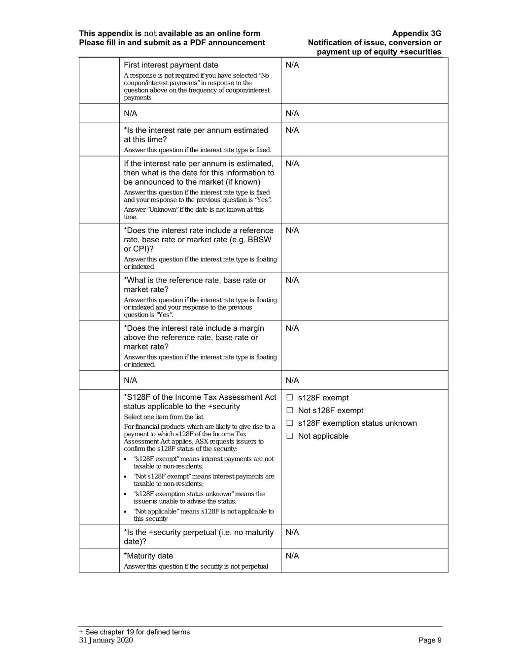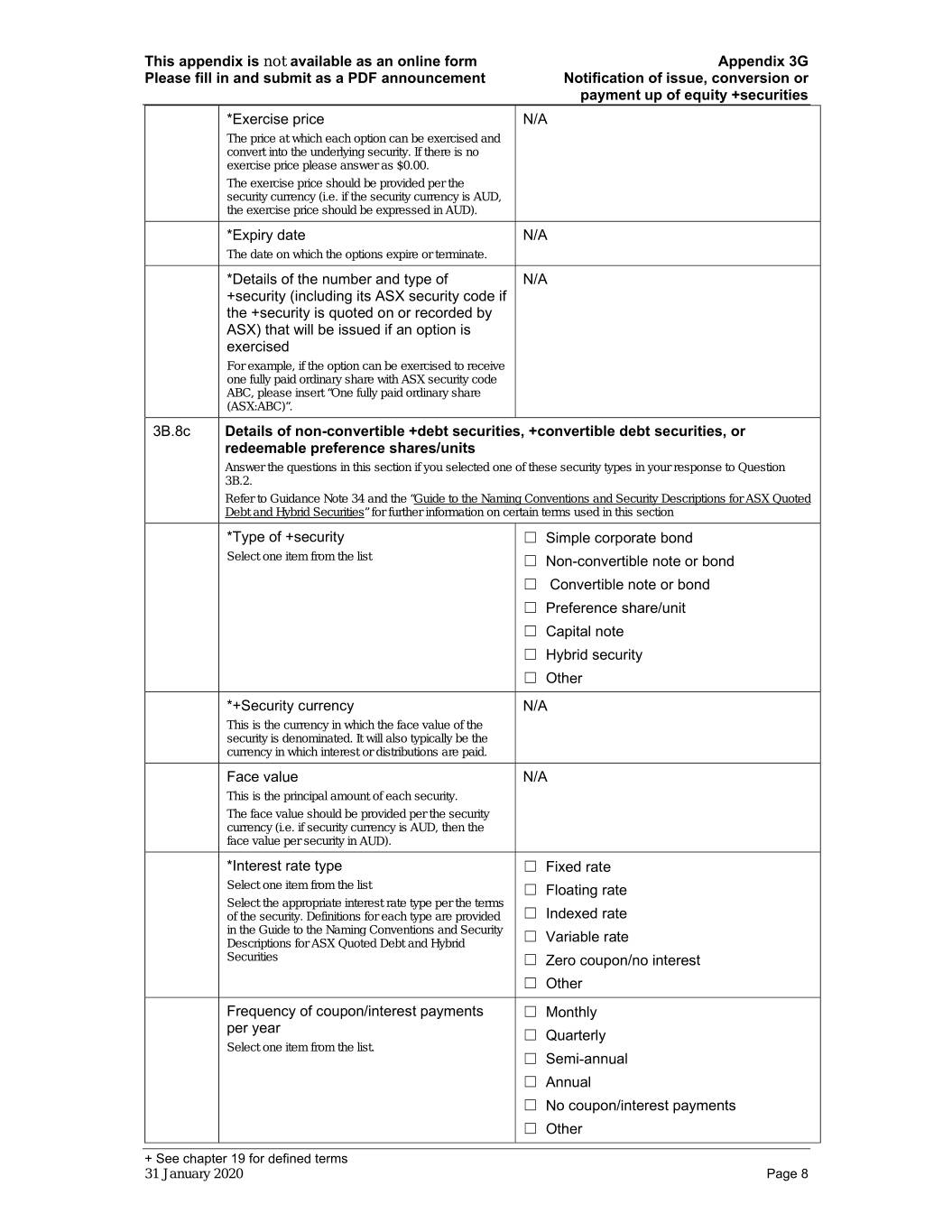 This appendix is not available as an online form Appendix 3G Please fill in and submit as a PDF announcement Notification of issue, conversion or payment up of equity +securities *Exercise price N/A The price at which each option can be exercised and convert into the underlying security. If there is no exercise price please answer as $0.00. The exercise price should be provided per the security currency (i.e. if the security currency is AUD, the exercise price should be expressed in AUD). *Expiry date N/A The date on which the options expire or terminate. *Details of the number and type of N/A +security (including its ASX security code if the +security is quoted on or recorded by ASX) that will be issued if an option is exercised For example, if the option can be exercised to receive one fully paid ordinary share with ASX security code ABC, please insert “One fully paid ordinary share (ASX:ABC)“. 3B.8c Details of non-convertible +debt securities, +convertible debt securities, or redeemable preference shares/units Answer the questions in this section if you selected one of these security types in your response to Question 3B.2. Refer to Guidance Note 34 and the “Guide to the Naming Conventions and Security Descriptions for ASX Quoted Debt and Hybrid Securities” for further information on certain terms used in this section *Type of +security ☐ Simple corporate bond Select one item from the list ☐ Non-convertible note or bond ☐ Convertible note or bond ☐ Preference share/unit ☐ Capital note ☐ Hybrid security ☐ Other *+Security currency N/A This is the currency in which the face value of the security is denominated. It will also typically be the currency in which interest or distributions are paid. Face value N/A This is the principal amount of each security. The face value should be provided per the security currency (i.e. if security currency is AUD, then the face value per security in AUD). *Interest rate type ☐ Fixed rate Select one item from the list ☐ Floating rate Select the appropriate interest rate type per the terms of the security. Definitions for each type are provided ☐ Indexed rate in the Guide to the Naming Conventions and Security ☐ Descriptions for ASX Quoted Debt and Hybrid Variable rate Securities ☐ Zero coupon/no interest ☐ Other Frequency of coupon/interest payments ☐ Monthly per year ☐ Quarterly Select one item from the list. ☐ Semi-annual ☐ Annual ☐ No coupon/interest payments ☐ Other + See chapter 19 for defined terms 31 January 2020 Page 8