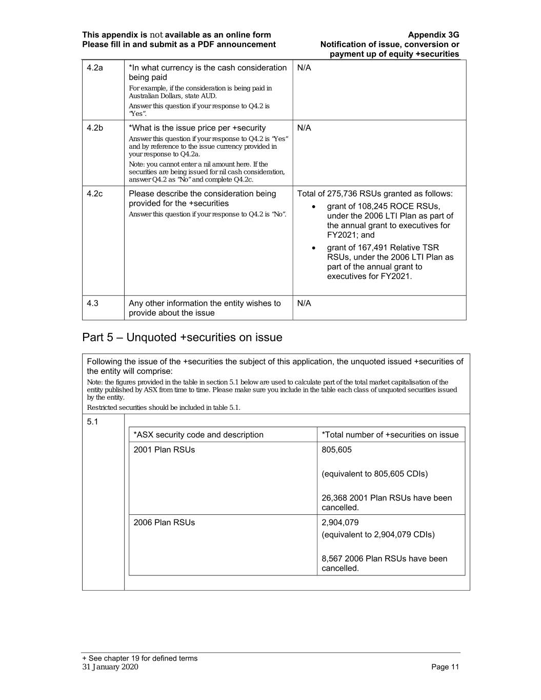 This appendix is not available as an online form Appendix 3G Please fill in and submit as a PDF announcement Notification of issue, conversion or payment up of equity +securities 4.2a *In what currency is the cash consideration N/A being paid For example, if the consideration is being paid in Australian Dollars, state AUD. Answer this question if your response to Q4.2 is “Yes”. 4.2b *What is the issue price per +security N/A Answer this question if your response to Q4.2 is “Yes” and by reference to the issue currency provided in your response to Q4.2a. Note: you cannot enter a nil amount here. If the securities are being issued for nil cash consideration, answer Q4.2 as “No” and complete Q4.2c. 4.2c Please describe the consideration being Total of 275,736 RSUs granted as follows: provided for the +securities grant of 108,245 ROCE RSUs, Answer this question if your response to Q4.2 is “No”. under the 2006 LTI Plan as part of the annual grant to executives for FY2021; and grant of 167,491 Relative TSR RSUs, under the 2006 LTI Plan as part of the annual grant to executives for FY2021. 4.3 Any other information the entity wishes to N/A provide about the issue Part 5 – Unquoted +securities on issue Following the issue of the +securities the subject of this application, the unquoted issued +securities of the entity will comprise: Note: the figures provided in the table in section 5.1 below are used to calculate part of the total market capitalisation of the entity published by ASX from time to time. Please make sure you include in the table each class of unquoted securities issued by the entity. Restricted securities should be included in table 5.1. 5.1 *ASX security code and description *Total number of +securities on issue 2001 Plan RSUs 805,605 (equivalent to 805,605 CDIs) 26,368 2001 Plan RSUs have been cancelled. 2006 Plan RSUs 2,904,079 (equivalent to 2,904,079 CDIs) 8,567 2006 Plan RSUs have been cancelled. + See chapter 19 for defined terms 31 January 2020 Page 11