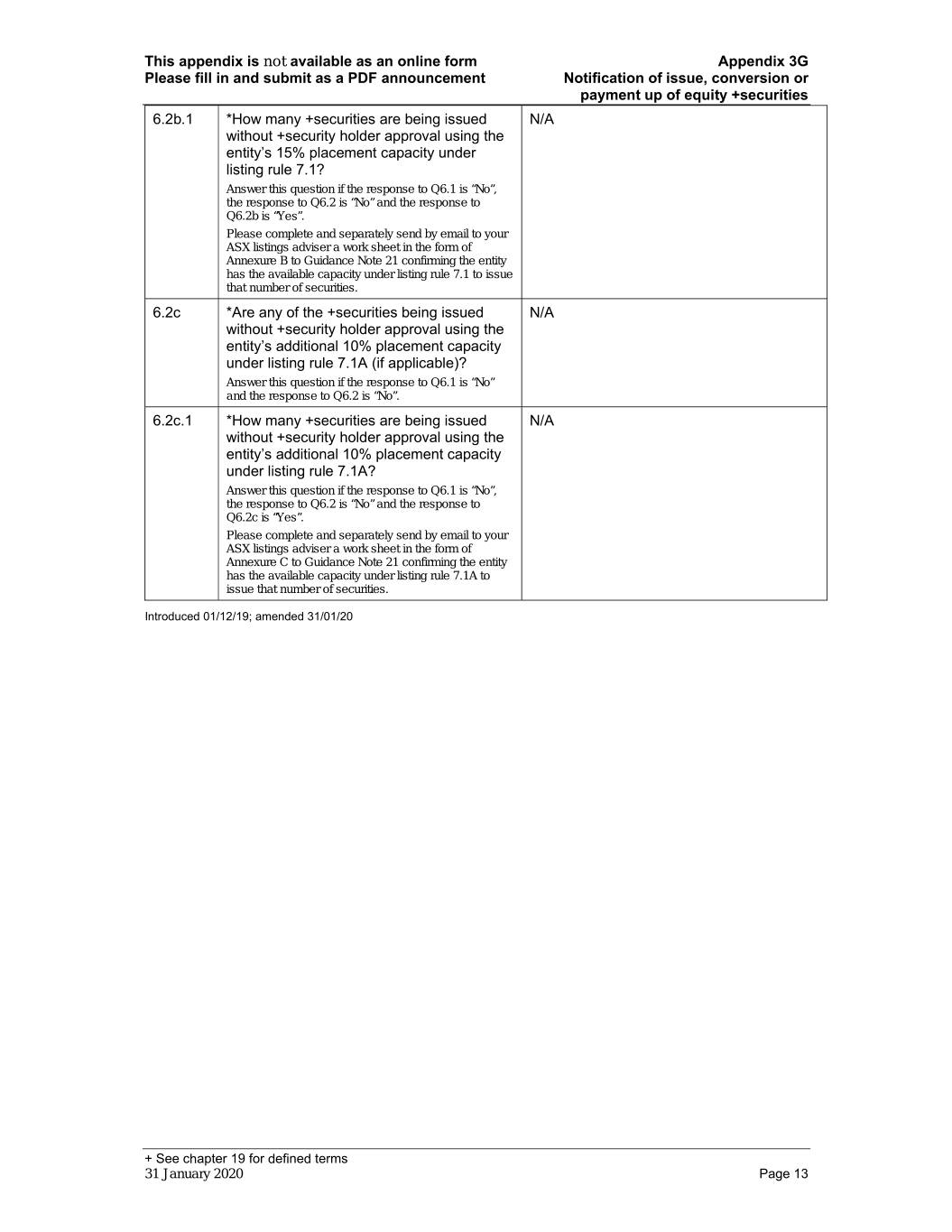 This appendix is not available as an online form Appendix 3G Please fill in and submit as a PDF announcement Notification of issue, conversion or payment up of equity +securities 6.2b.1 *How many +securities are being issued N/A without +security holder approval using the entity’s 15% placement capacity under listing rule 7.1? Answer this question if the response to Q6.1 is “No”, the response to Q6.2 is “No” and the response to Q6.2b is “Yes”. Please complete and separately send by email to your ASX listings adviser a work sheet in the form of Annexure B to Guidance Note 21 confirming the entity has the available capacity under listing rule 7.1 to issue that number of securities. 6.2c *Are any of the +securities being issued N/A without +security holder approval using the entity’s additional 10% placement capacity under listing rule 7.1A (if applicable)? Answer this question if the response to Q6.1 is “No” and the response to Q6.2 is “No”. 6.2c.1 *How many +securities are being issued N/A without +security holder approval using the entity’s additional 10% placement capacity under listing rule 7.1A? Answer this question if the response to Q6.1 is “No”, the response to Q6.2 is “No” and the response to Q6.2c is “Yes”. Please complete and separately send by email to your ASX listings adviser a work sheet in the form of Annexure C to Guidance Note 21 confirming the entity has the available capacity under listing rule 7.1A to issue that number of securities. Introduced 01/12/19; amended 31/01/20 + See chapter 19 for defined terms 31 January 2020 Page 13