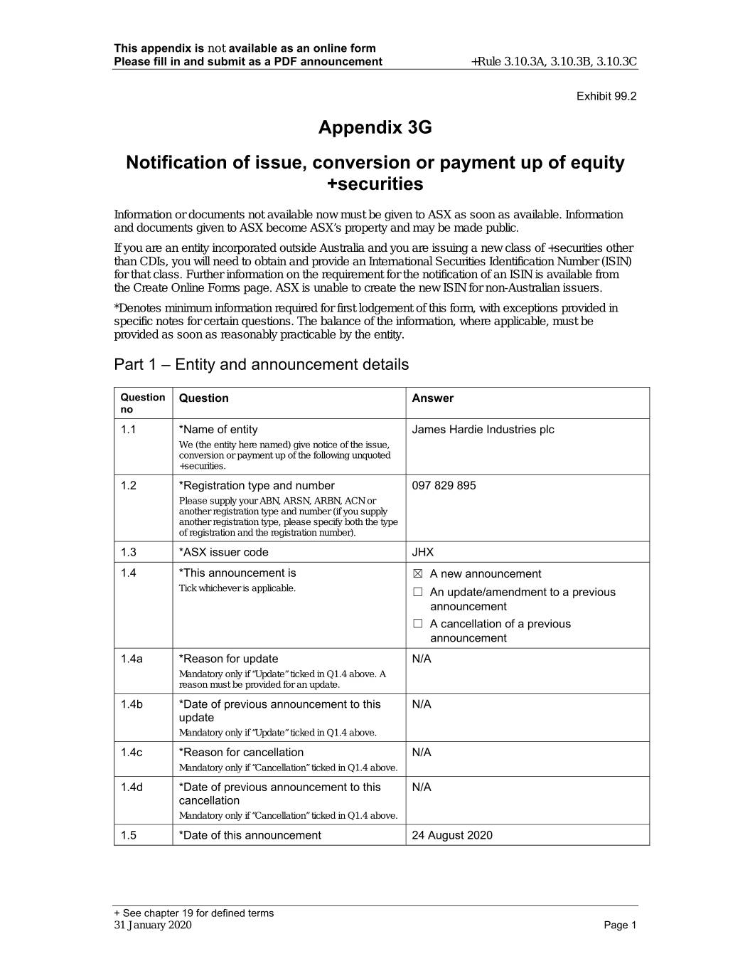 This appendix is not available as an online form Please fill in and submit as a PDF announcement +Rule 3.10.3A, 3.10.3B, 3.10.3C Exhibit 99.2 Appendix 3G Notification of issue, conversion or payment up of equity +securities Information or documents not available now must be given to ASX as soon as available. Information and documents given to ASX become ASX’s property and may be made public. If you are an entity incorporated outside Australia and you are issuing a new class of +securities other than CDIs, you will need to obtain and provide an International Securities Identification Number (ISIN) for that class. Further information on the requirement for the notification of an ISIN is available from the Create Online Forms page. ASX is unable to create the new ISIN for non-Australian issuers. *Denotes minimum information required for first lodgement of this form, with exceptions provided in specific notes for certain questions. The balance of the information, where applicable, must be provided as soon as reasonably practicable by the entity. Part 1 – Entity and announcement details Question Question Answer no 1.1 *Name of entity James Hardie Industries plc We (the entity here named) give notice of the issue, conversion or payment up of the following unquoted +securities. 1.2 *Registration type and number 097 829 895 Please supply your ABN, ARSN, ARBN, ACN or another registration type and number (if you supply another registration type, please specify both the type of registration and the registration number). 1.3 *ASX issuer code JHX 1.4 *This announcement is ☒ A new announcement Tick whichever is applicable. ☐ An update/amendment to a previous announcement ☐ A cancellation of a previous announcement 1.4a *Reason for update N/A Mandatory only if “Update” ticked in Q1.4 above. A reason must be provided for an update. 1.4b *Date of previous announcement to this N/A update Mandatory only if “Update” ticked in Q1.4 above. 1.4c *Reason for cancellation N/A Mandatory only if “Cancellation” ticked in Q1.4 above. 1.4d *Date of previous announcement to this N/A cancellation Mandatory only if “Cancellation” ticked in Q1.4 above. 1.5 *Date of this announcement 24 August 2020 + See chapter 19 for defined terms 31 January 2020 Page 1