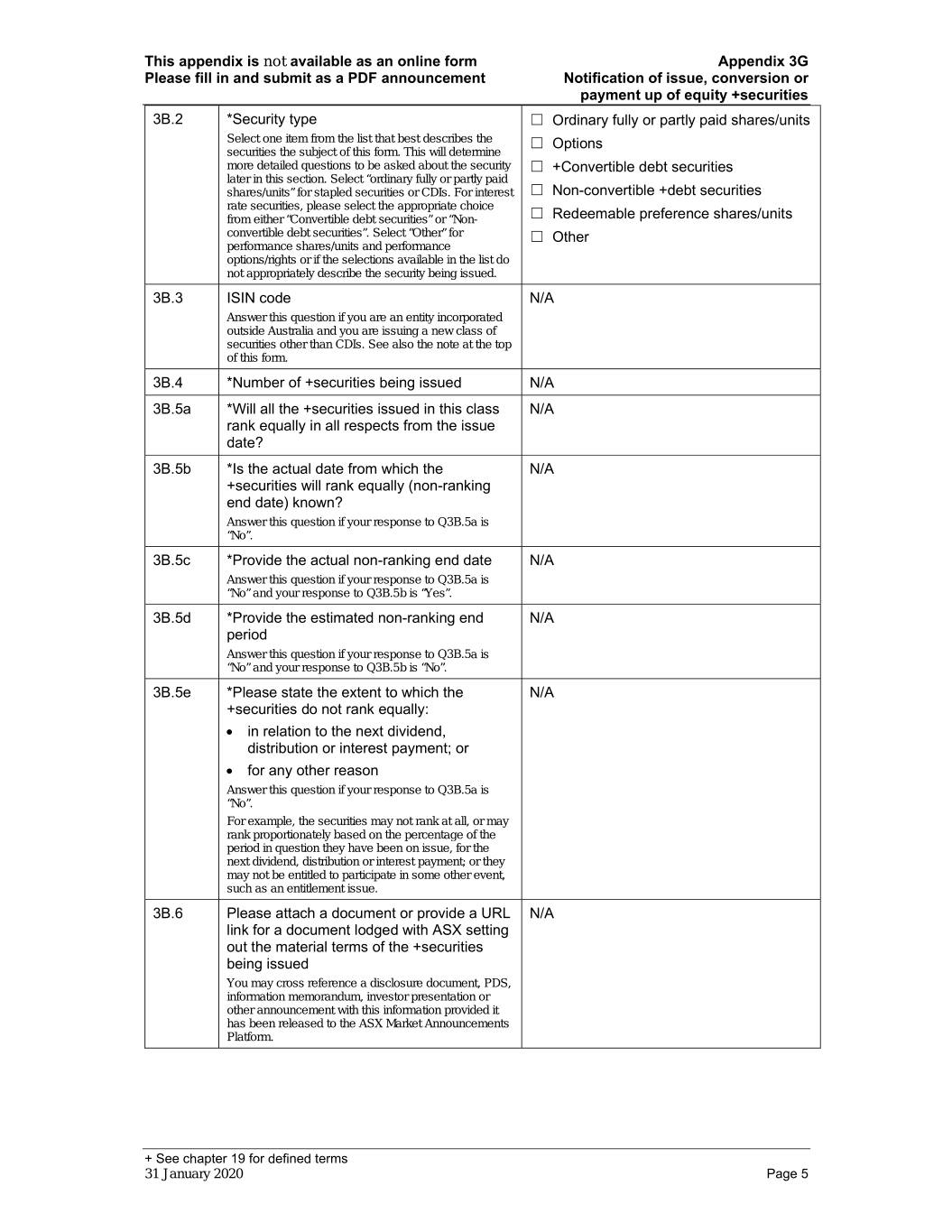 This appendix is not available as an online form Appendix 3G Please fill in and submit as a PDF announcement Notification of issue, conversion or payment up of equity +securities 3B.2 *Security type ☐ Ordinary fully or partly paid shares/units Select one item from the list that best describes the ☐ Options securities the subject of this form. This will determine more detailed questions to be asked about the security ☐ +Convertible debt securities later in this section. Select “ordinary fully or partly paid shares/units” for stapled securities or CDIs. For interest ☐ Non-convertible +debt securities rate securities, please select the appropriate choice from either “Convertible debt securities” or “Non- ☐ Redeemable preference shares/units convertible debt securities”. Select “Other” for ☐ Other performance shares/units and performance options/rights or if the selections available in the list do not appropriately describe the security being issued. 3B.3 ISIN code N/A Answer this question if you are an entity incorporated outside Australia and you are issuing a new class of securities other than CDIs. See also the note at the top of this form. 3B.4 *Number of +securities being issued N/A 3B.5a *Will all the +securities issued in this class N/A rank equally in all respects from the issue date? 3B.5b *Is the actual date from which the N/A +securities will rank equally (non-ranking end date) known? Answer this question if your response to Q3B.5a is “No”. 3B.5c *Provide the actual non-ranking end date N/A Answer this question if your response to Q3B.5a is “No” and your response to Q3B.5b is “Yes”. 3B.5d *Provide the estimated non-ranking end N/A period Answer this question if your response to Q3B.5a is “No” and your response to Q3B.5b is “No”. 3B.5e *Please state the extent to which the N/A +securities do not rank equally: in relation to the next dividend, distribution or interest payment; or for any other reason Answer this question if your response to Q3B.5a is “No”. For example, the securities may not rank at all, or may rank proportionately based on the percentage of the period in question they have been on issue, for the next dividend, distribution or interest payment; or they may not be entitled to participate in some other event, such as an entitlement issue. 3B.6 Please attach a document or provide a URL N/A link for a document lodged with ASX setting out the material terms of the +securities being issued You may cross reference a disclosure document, PDS, information memorandum, investor presentation or other announcement with this information provided it has been released to the ASX Market Announcements Platform. + See chapter 19 for defined terms 31 January 2020 Page 5