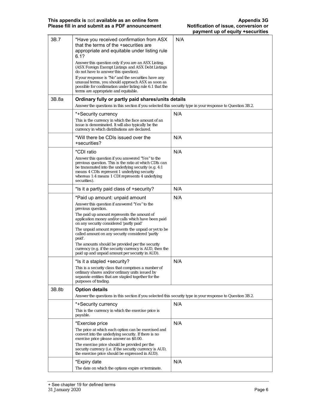 This appendix is not available as an online form Appendix 3G Please fill in and submit as a PDF announcement Notification of issue, conversion or payment up of equity +securities 3B.7 *Have you received confirmation from ASX N/A that the terms of the +securities are appropriate and equitable under listing rule 6.1? Answer this question only if you are an ASX Listing. (ASX Foreign Exempt Listings and ASX Debt Listings do not have to answer this question). If your response is “No” and the securities have any unusual terms, you should approach ASX as soon as possible for confirmation under listing rule 6.1 that the terms are appropriate and equitable. 3B.8a Ordinary fully or partly paid shares/units details Answer the questions in this section if you selected this security type in your response to Question 3B.2. *+Security currency N/A This is the currency in which the face amount of an issue is denominated. It will also typically be the currency in which distributions are declared. *Will there be CDIs issued over the N/A +securities? *CDI ratio N/A Answer this question if you answered “Yes” to the previous question. This is the ratio at which CDIs can be transmuted into the underlying security (e.g. 4:1 means 4 CDIs represent 1 underlying security whereas 1:4 means 1 CDI represents 4 underlying securities). *Is it a partly paid class of +security? N/A *Paid up amount: unpaid amount N/A Answer this question if answered “Yes” to the previous question. The paid up amount represents the amount of application money and/or calls which have been paid on any security considered ‘partly paid’ The unpaid amount represents the unpaid or yet to be called amount on any security considered ‘partly paid’. The amounts should be provided per the security currency (e.g. if the security currency is AUD, then the paid up and unpaid amount per security in AUD). *Is it a stapled +security? N/A This is a security class that comprises a number of ordinary shares and/or ordinary units issued by separate entities that are stapled together for the purposes of trading. 3B.8b Option details Answer the questions in this section if you selected this security type in your response to Question 3B.2. *+Security currency N/A This is the currency in which the exercise price is payable. *Exercise price N/A The price at which each option can be exercised and convert into the underlying security. If there is no exercise price please answer as $0.00. The exercise price should be provided per the security currency (i.e. if the security currency is AUD, the exercise price should be expressed in AUD). *Expiry date N/A The date on which the options expire or terminate. + See chapter 19 for defined terms 31 January 2020 Page 6