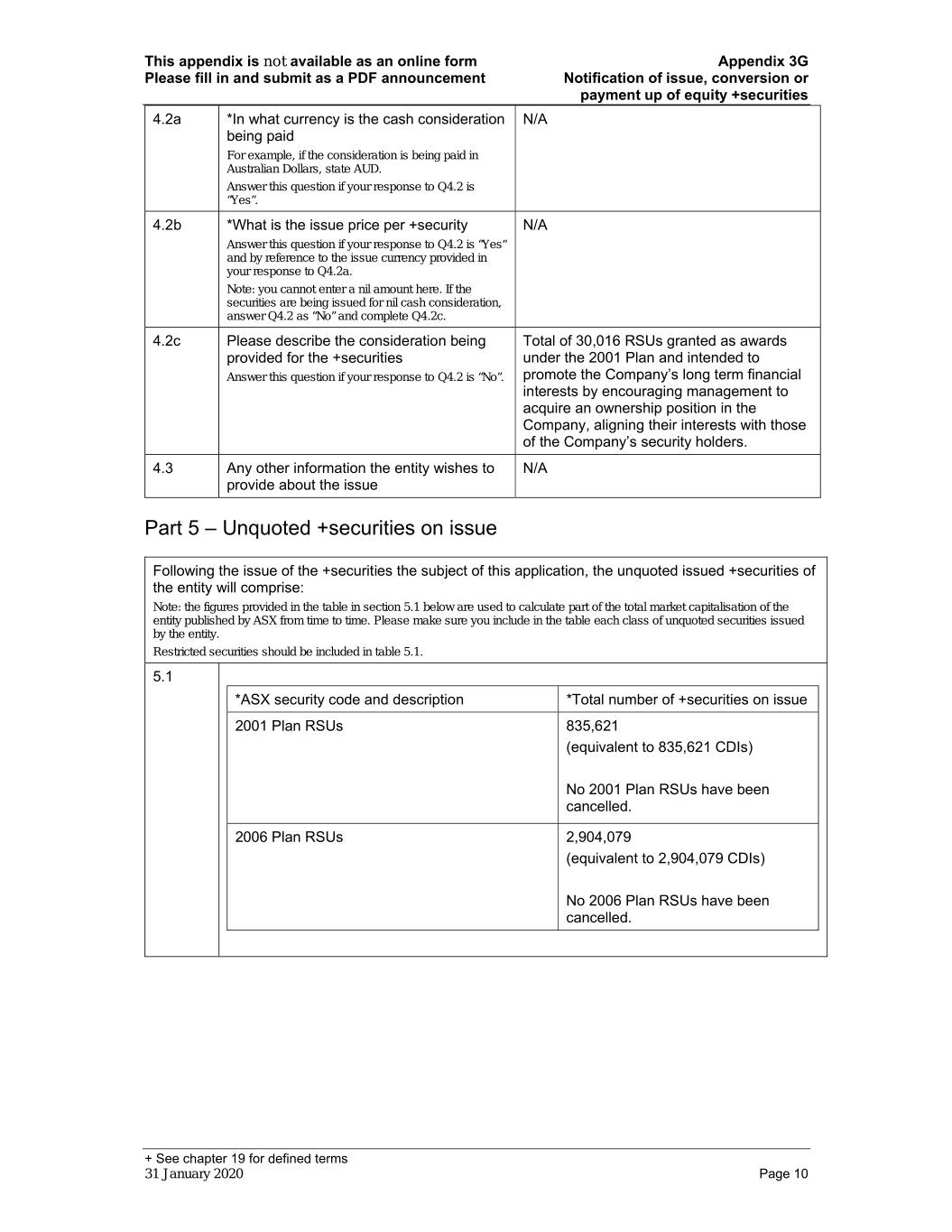 This appendix is not available as an online form Appendix 3G Please fill in and submit as a PDF announcement Notification of issue, conversion or payment up of equity +securities 4.2a *In what currency is the cash consideration N/A being paid For example, if the consideration is being paid in Australian Dollars, state AUD. Answer this question if your response to Q4.2 is “Yes”. 4.2b *What is the issue price per +security N/A Answer this question if your response to Q4.2 is “Yes” and by reference to the issue currency provided in your response to Q4.2a. Note: you cannot enter a nil amount here. If the securities are being issued for nil cash consideration, answer Q4.2 as “No” and complete Q4.2c. 4.2c Please describe the consideration being Total of 30,016 RSUs granted as awards provided for the +securities under the 2001 Plan and intended to Answer this question if your response to Q4.2 is “No”. promote the Company’s long term financial interests by encouraging management to acquire an ownership position in the Company, aligning their interests with those of the Company’s security holders. 4.3 Any other information the entity wishes to N/A provide about the issue Part 5 – Unquoted +securities on issue Following the issue of the +securities the subject of this application, the unquoted issued +securities of the entity will comprise: Note: the figures provided in the table in section 5.1 below are used to calculate part of the total market capitalisation of the entity published by ASX from time to time. Please make sure you include in the table each class of unquoted securities issued by the entity. Restricted securities should be included in table 5.1. 5.1 *ASX security code and description *Total number of +securities on issue 2001 Plan RSUs 835,621 (equivalent to 835,621 CDIs) No 2001 Plan RSUs have been cancelled. 2006 Plan RSUs 2,904,079 (equivalent to 2,904,079 CDIs) No 2006 Plan RSUs have been cancelled. + See chapter 19 for defined terms 31 January 2020 Page 10