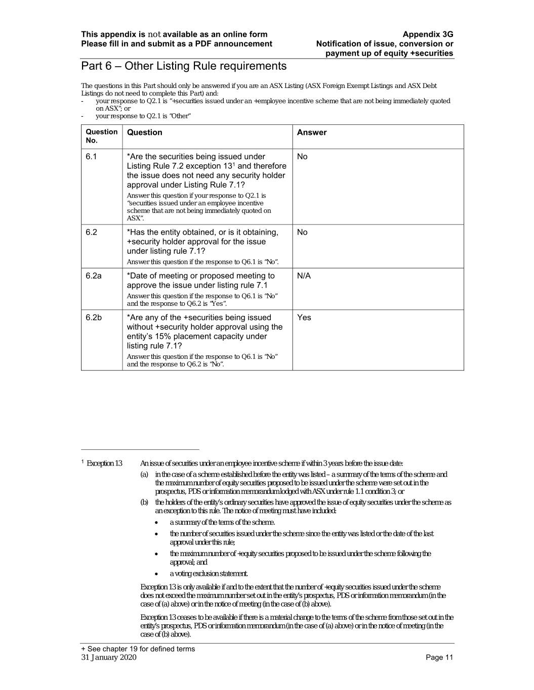 This appendix is not available as an online form Appendix 3G Please fill in and submit as a PDF announcement Notification of issue, conversion or payment up of equity +securities Part 6 – Other Listing Rule requirements The questions in this Part should only be answered if you are an ASX Listing (ASX Foreign Exempt Listings and ASX Debt Listings do not need to complete this Part) and: - your response to Q2.1 is “+securities issued under an +employee incentive scheme that are not being immediately quoted on ASX”; or - your response to Q2.1 is “Other” Question Question Answer No. 6.1 *Are the securities being issued under No Listing Rule 7.2 exception 131 and therefore the issue does not need any security holder approval under Listing Rule 7.1? Answer this question if your response to Q2.1 is “securities issued under an employee incentive scheme that are not being immediately quoted on ASX”. 6.2 *Has the entity obtained, or is it obtaining, No +security holder approval for the issue under listing rule 7.1? Answer this question if the response to Q6.1 is “No”. 6.2a *Date of meeting or proposed meeting to N/A approve the issue under listing rule 7.1 Answer this question if the response to Q6.1 is “No” and the response to Q6.2 is “Yes”. 6.2b *Are any of the +securities being issued Yes without +security holder approval using the entity’s 15% placement capacity under listing rule 7.1? Answer this question if the response to Q6.1 is “No” and the response to Q6.2 is “No”. 1 Exception 13 An issue of securities under an employee incentive scheme if within 3 years before the issue date: (a) in the case of a scheme established before the entity was listed – a summary of the terms of the scheme and the maximum number of equity securities proposed to be issued under the scheme were set out in the prospectus, PDS or information memorandum lodged with ASX under rule 1.1 condition 3; or (b) the holders of the entity’s ordinary securities have approved the issue of equity securities under the scheme as an exception to this rule. The notice of meeting must have included: a summary of the terms of the scheme. the number of securities issued under the scheme since the entity was listed or the date of the last approval under this rule; the maximum number of +equity securities proposed to be issued under the scheme following the approval; and a voting exclusion statement. Exception 13 is only available if and to the extent that the number of +equity securities issued under the scheme does not exceed the maximum number set out in the entity’s prospectus, PDS or information memorandum (in the case of (a) above) or in the notice of meeting (in the case of (b) above). Exception 13 ceases to be available if there is a material change to the terms of the scheme from those set out in the entity’s prospectus, PDS or information memorandum (in the case of (a) above) or in the notice of meeting (in the case of (b) above). + See chapter 19 for defined terms 31 January 2020 Page 11