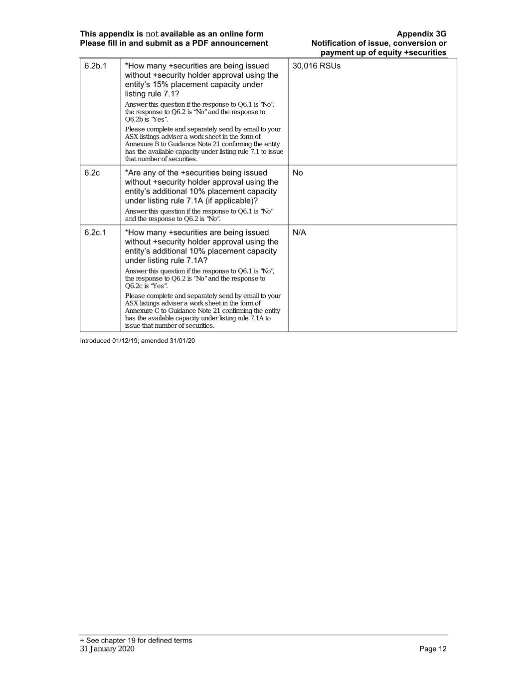 This appendix is not available as an online form Appendix 3G Please fill in and submit as a PDF announcement Notification of issue, conversion or payment up of equity +securities 6.2b.1 *How many +securities are being issued 30,016 RSUs without +security holder approval using the entity’s 15% placement capacity under listing rule 7.1? Answer this question if the response to Q6.1 is “No”, the response to Q6.2 is “No” and the response to Q6.2b is “Yes”. Please complete and separately send by email to your ASX listings adviser a work sheet in the form of Annexure B to Guidance Note 21 confirming the entity has the available capacity under listing rule 7.1 to issue that number of securities. 6.2c *Are any of the +securities being issued No without +security holder approval using the entity’s additional 10% placement capacity under listing rule 7.1A (if applicable)? Answer this question if the response to Q6.1 is “No” and the response to Q6.2 is “No”. 6.2c.1 *How many +securities are being issued N/A without +security holder approval using the entity’s additional 10% placement capacity under listing rule 7.1A? Answer this question if the response to Q6.1 is “No”, the response to Q6.2 is “No” and the response to Q6.2c is “Yes”. Please complete and separately send by email to your ASX listings adviser a work sheet in the form of Annexure C to Guidance Note 21 confirming the entity has the available capacity under listing rule 7.1A to issue that number of securities. Introduced 01/12/19; amended 31/01/20 + See chapter 19 for defined terms 31 January 2020 Page 12