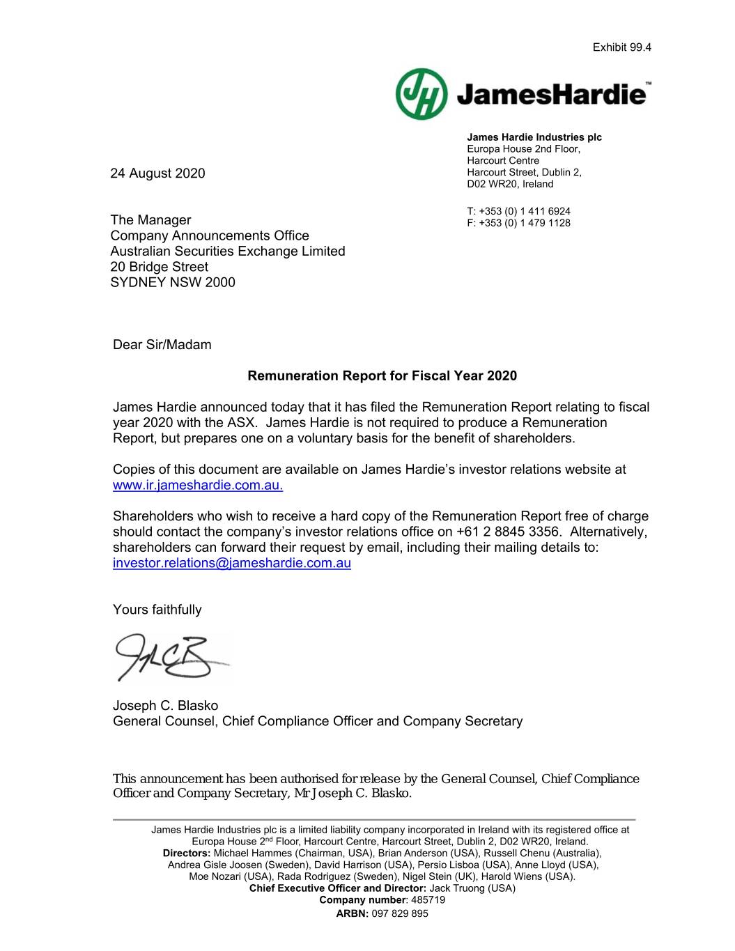 Exhibit 99.4 James Hardie Industries plc Europa House 2nd Floor, Harcourt Centre 24 August 2020 Harcourt Street, Dublin 2, D02 WR20, Ireland T: +353 (0) 1 411 6924 The Manager F: +353 (0) 1 479 1128 Company Announcements Office Australian Securities Exchange Limited 20 Bridge Street SYDNEY NSW 2000 Dear Sir/Madam Remuneration Report for Fiscal Year 2020 James Hardie announced today that it has filed the Remuneration Report relating to fiscal year 2020 with the ASX. James Hardie is not required to produce a Remuneration Report, but prepares one on a voluntary basis for the benefit of shareholders. Copies of this document are available on James Hardie’s investor relations website at www.ir.jameshardie.com.au. Shareholders who wish to receive a hard copy of the Remuneration Report free of charge should contact the company’s investor relations office on +61 2 8845 3356. Alternatively, shareholders can forward their request by email, including their mailing details to: [email protected] Yours faithfully Joseph C. Blasko General Counsel, Chief Compliance Officer and Company Secretary This announcement has been authorised for release by the General Counsel, Chief Compliance Officer and Company Secretary, Mr Joseph C. Blasko. James Hardie Industries plc is a limited liability company incorporated in Ireland with its registered office at Europa House 2nd Floor, Harcourt Centre, Harcourt Street, Dublin 2, D02 WR20, Ireland. Directors: Michael Hammes (Chairman, USA), Brian Anderson (USA), Russell Chenu (Australia), Andrea Gisle Joosen (Sweden), David Harrison (USA), Persio Lisboa (USA), Anne Lloyd (USA), Moe Nozari (USA), Rada Rodriguez (Sweden), Nigel Stein (UK), Harold Wiens (USA). Chief Executive Officer and Director: Jack Truong (USA) Company number: 485719 ARBN: 097 829 895
