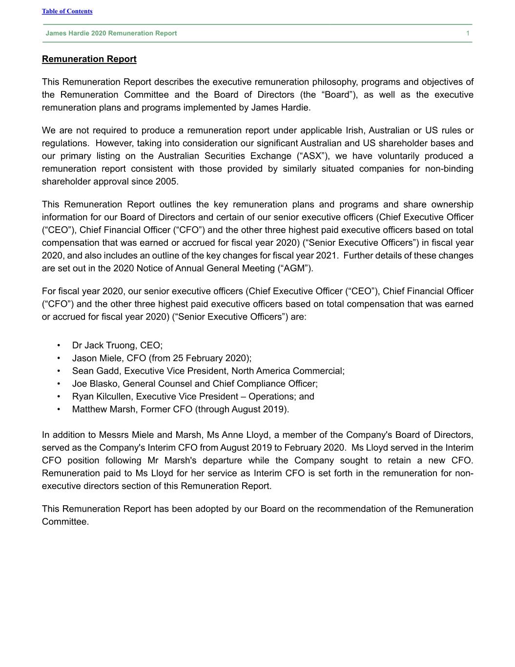 Table of Contents James Hardie 2020 Remuneration Report 1 Remuneration Report This Remuneration Report describes the executive remuneration philosophy, programs and objectives of the Remuneration Committee and the Board of Directors (the “Board”), as well as the executive remuneration plans and programs implemented by James Hardie. We are not required to produce a remuneration report under applicable Irish, Australian or US rules or regulations. However, taking into consideration our significant Australian and US shareholder bases and our primary listing on the Australian Securities Exchange (“ASX”), we have voluntarily produced a remuneration report consistent with those provided by similarly situated companies for non-binding shareholder approval since 2005. This Remuneration Report outlines the key remuneration plans and programs and share ownership information for our Board of Directors and certain of our senior executive officers (Chief Executive Officer (“CEO”), Chief Financial Officer (“CFO”) and the other three highest paid executive officers based on total compensation that was earned or accrued for fiscal year 2020) (“Senior Executive Officers”) in fiscal year 2020, and also includes an outline of the key changes for fiscal year 2021. Further details of these changes are set out in the 2020 Notice of Annual General Meeting (“AGM”). For fiscal year 2020, our senior executive officers (Chief Executive Officer (“CEO”), Chief Financial Officer (“CFO”) and the other three highest paid executive officers based on total compensation that was earned or accrued for fiscal year 2020) (“Senior Executive Officers”) are: • Dr Jack Truong, CEO; • Jason Miele, CFO (from 25 February 2020); • Sean Gadd, Executive Vice President, North America Commercial; • Joe Blasko, General Counsel and Chief Compliance Officer; • Ryan Kilcullen, Executive Vice President – Operations; and • Matthew Marsh, Former CFO (through August 2019). In addition to Messrs Miele and Marsh, Ms Anne Lloyd, a member of the Company's Board of Directors, served as the Company's Interim CFO from August 2019 to February 2020. Ms Lloyd served in the Interim CFO position following Mr Marsh's departure while the Company sought to retain a new CFO. Remuneration paid to Ms Lloyd for her service as Interim CFO is set forth in the remuneration for non- executive directors section of this Remuneration Report. This Remuneration Report has been adopted by our Board on the recommendation of the Remuneration Committee.