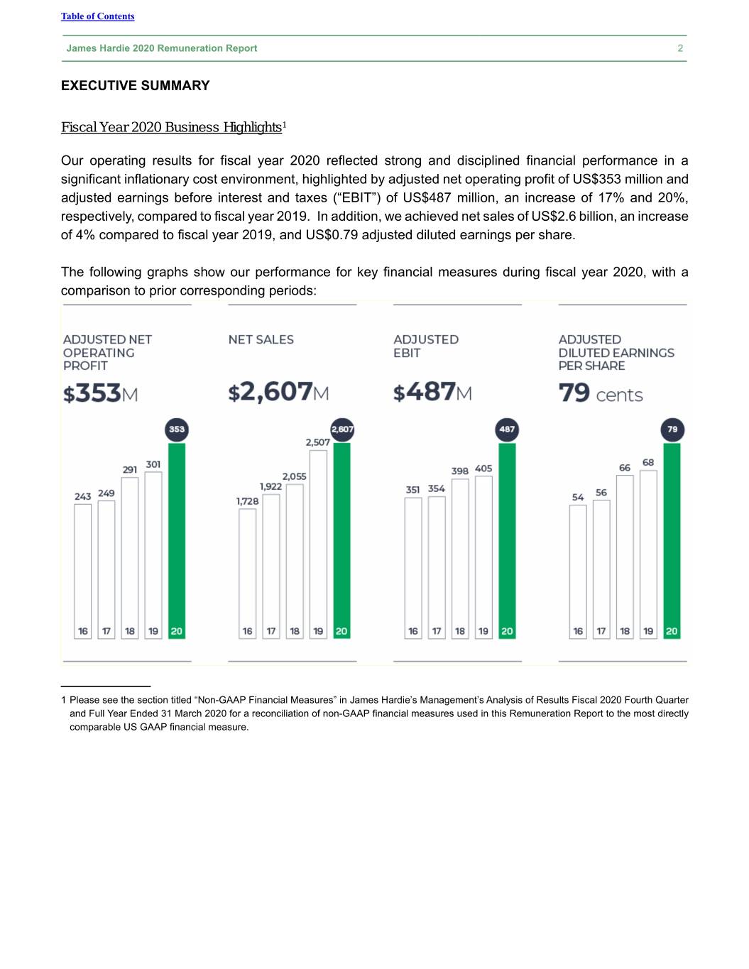 Table of Contents James Hardie 2020 Remuneration Report 2 EXECUTIVE SUMMARY Fiscal Year 2020 Business Highlights1 Our operating results for fiscal year 2020 reflected strong and disciplined financial performance in a significant inflationary cost environment, highlighted by adjusted net operating profit of US$353 million and adjusted earnings before interest and taxes (“EBIT”) of US$487 million, an increase of 17% and 20%, respectively, compared to fiscal year 2019. In addition, we achieved net sales of US$2.6 billion, an increase of 4% compared to fiscal year 2019, and US$0.79 adjusted diluted earnings per share. The following graphs show our performance for key financial measures during fiscal year 2020, with a comparison to prior corresponding periods: ____________ 1 Please see the section titled “Non-GAAP Financial Measures” in James Hardie’s Management’s Analysis of Results Fiscal 2020 Fourth Quarter and Full Year Ended 31 March 2020 for a reconciliation of non-GAAP financial measures used in this Remuneration Report to the most directly comparable US GAAP financial measure.