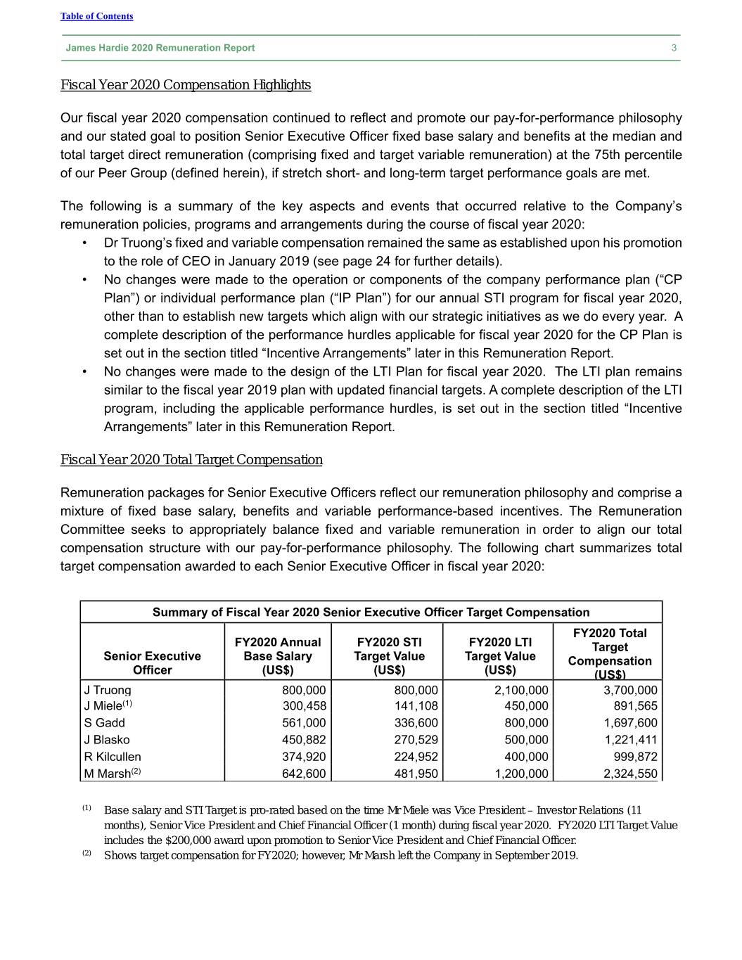 Table of Contents James Hardie 2020 Remuneration Report 3 Fiscal Year 2020 Compensation Highlights Our fiscal year 2020 compensation continued to reflect and promote our pay-for-performance philosophy and our stated goal to position Senior Executive Officer fixed base salary and benefits at the median and total target direct remuneration (comprising fixed and target variable remuneration) at the 75th percentile of our Peer Group (defined herein), if stretch short- and long-term target performance goals are met. The following is a summary of the key aspects and events that occurred relative to the Company’s remuneration policies, programs and arrangements during the course of fiscal year 2020: • Dr Truong’s fixed and variable compensation remained the same as established upon his promotion to the role of CEO in January 2019 (see page 24 for further details). • No changes were made to the operation or components of the company performance plan (“CP Plan”) or individual performance plan (“IP Plan”) for our annual STI program for fiscal year 2020, other than to establish new targets which align with our strategic initiatives as we do every year. A complete description of the performance hurdles applicable for fiscal year 2020 for the CP Plan is set out in the section titled “Incentive Arrangements” later in this Remuneration Report. • No changes were made to the design of the LTI Plan for fiscal year 2020. The LTI plan remains similar to the fiscal year 2019 plan with updated financial targets. A complete description of the LTI program, including the applicable performance hurdles, is set out in the section titled “Incentive Arrangements” later in this Remuneration Report. Fiscal Year 2020 Total Target Compensation Remuneration packages for Senior Executive Officers reflect our remuneration philosophy and comprise a mixture of fixed base salary, benefits and variable performance-based incentives. The Remuneration Committee seeks to appropriately balance fixed and variable remuneration in order to align our total compensation structure with our pay-for-performance philosophy. The following chart summarizes total target compensation awarded to each Senior Executive Officer in fiscal year 2020: Summary of Fiscal Year 2020 Senior Executive Officer Target Compensation FY2020 Total FY2020 Annual FY2020 STI FY2020 LTI Target Senior Executive Base Salary Target Value Target Value Compensation Officer (US$) (US$) (US$) (US$) J Truong 800,000 800,000 2,100,000 3,700,000 J Miele(1) 300,458 141,108 450,000 891,565 S Gadd 561,000 336,600 800,000 1,697,600 J Blasko 450,882 270,529 500,000 1,221,411 R Kilcullen 374,920 224,952 400,000 999,872 M Marsh(2) 642,600 481,950 1,200,000 2,324,550 (1) Base salary and STI Target is pro-rated based on the time Mr Miele was Vice President – Investor Relations (11 months), Senior Vice President and Chief Financial Officer (1 month) during fiscal year 2020. FY2020 LTI Target Value includes the $200,000 award upon promotion to Senior Vice President and Chief Financial Officer. (2) Shows target compensation for FY2020; however, Mr Marsh left the Company in September 2019.