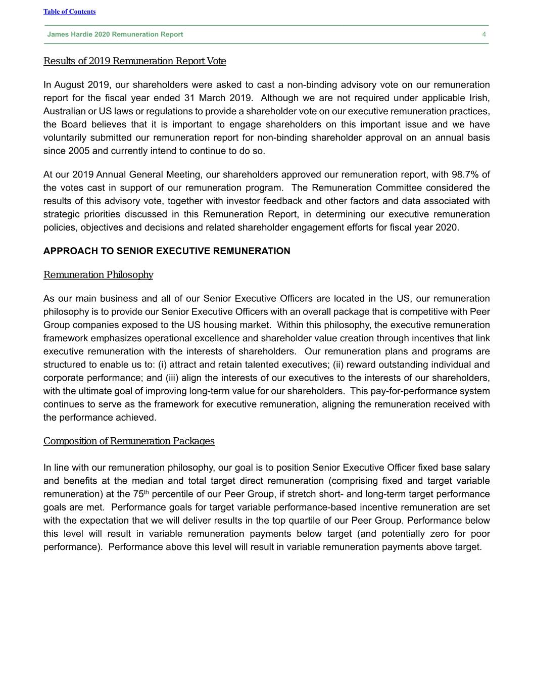 Table of Contents James Hardie 2020 Remuneration Report 4 Results of 2019 Remuneration Report Vote In August 2019, our shareholders were asked to cast a non-binding advisory vote on our remuneration report for the fiscal year ended 31 March 2019. Although we are not required under applicable Irish, Australian or US laws or regulations to provide a shareholder vote on our executive remuneration practices, the Board believes that it is important to engage shareholders on this important issue and we have voluntarily submitted our remuneration report for non-binding shareholder approval on an annual basis since 2005 and currently intend to continue to do so. At our 2019 Annual General Meeting, our shareholders approved our remuneration report, with 98.7% of the votes cast in support of our remuneration program. The Remuneration Committee considered the results of this advisory vote, together with investor feedback and other factors and data associated with strategic priorities discussed in this Remuneration Report, in determining our executive remuneration policies, objectives and decisions and related shareholder engagement efforts for fiscal year 2020. APPROACH TO SENIOR EXECUTIVE REMUNERATION Remuneration Philosophy As our main business and all of our Senior Executive Officers are located in the US, our remuneration philosophy is to provide our Senior Executive Officers with an overall package that is competitive with Peer Group companies exposed to the US housing market. Within this philosophy, the executive remuneration framework emphasizes operational excellence and shareholder value creation through incentives that link executive remuneration with the interests of shareholders. Our remuneration plans and programs are structured to enable us to: (i) attract and retain talented executives; (ii) reward outstanding individual and corporate performance; and (iii) align the interests of our executives to the interests of our shareholders, with the ultimate goal of improving long-term value for our shareholders. This pay-for-performance system continues to serve as the framework for executive remuneration, aligning the remuneration received with the performance achieved. Composition of Remuneration Packages In line with our remuneration philosophy, our goal is to position Senior Executive Officer fixed base salary and benefits at the median and total target direct remuneration (comprising fixed and target variable remuneration) at the 75th percentile of our Peer Group, if stretch short- and long-term target performance goals are met. Performance goals for target variable performance-based incentive remuneration are set with the expectation that we will deliver results in the top quartile of our Peer Group. Performance below this level will result in variable remuneration payments below target (and potentially zero for poor performance). Performance above this level will result in variable remuneration payments above target.