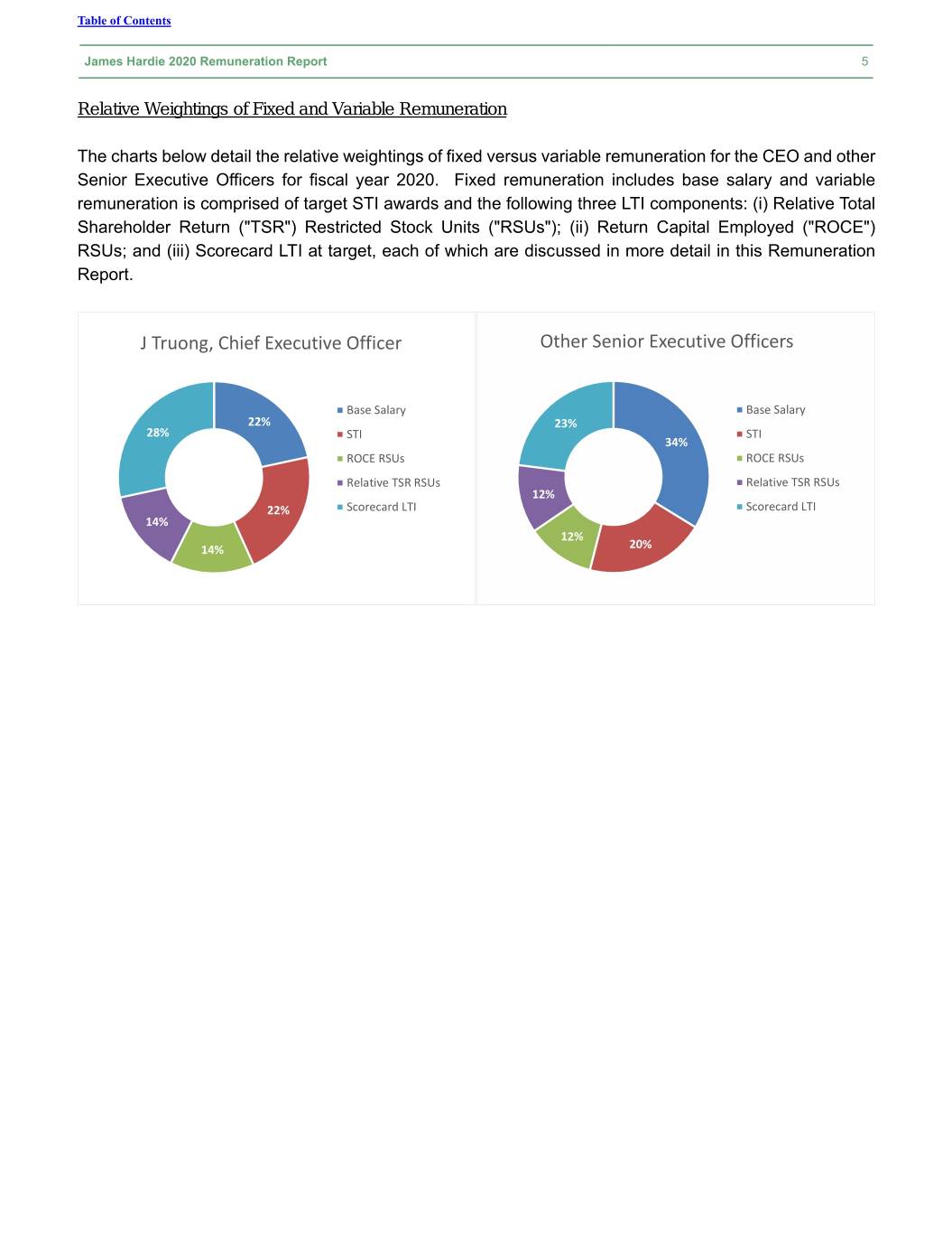 Table of Contents James Hardie 2020 Remuneration Report 5 Relative Weightings of Fixed and Variable Remuneration The charts below detail the relative weightings of fixed versus variable remuneration for the CEO and other Senior Executive Officers for fiscal year 2020. Fixed remuneration includes base salary and variable remuneration is comprised of target STI awards and the following three LTI components: (i) Relative Total Shareholder Return ("TSR") Restricted Stock Units ("RSUs"); (ii) Return Capital Employed ("ROCE") RSUs; and (iii) Scorecard LTI at target, each of which are discussed in more detail in this Remuneration Report. J Truong, Chief Executive Officer Other Senior Executive Officers Base Salary Base Salary 22% 23% 28% STI STI 34% ROCE RSUs ROCE RSUs Relative TSR RSUs Relative TSR RSUs 12% 22% Scorecard LTI Scorecard LTI 14% 12% 14% 20%