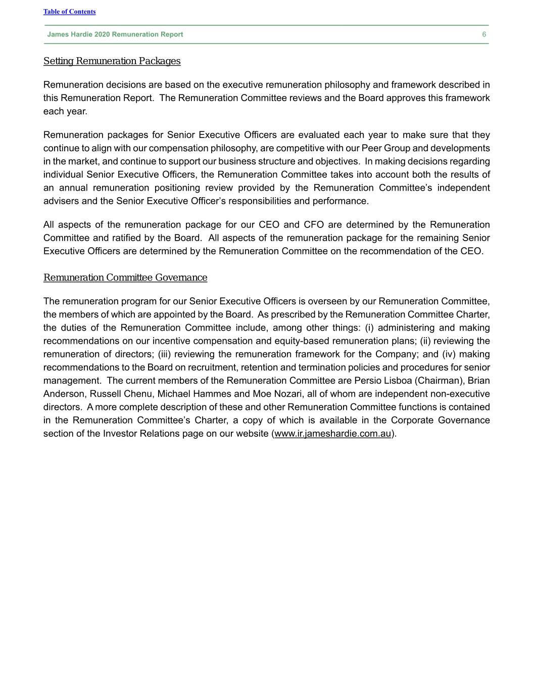 Table of Contents James Hardie 2020 Remuneration Report 6 Setting Remuneration Packages Remuneration decisions are based on the executive remuneration philosophy and framework described in this Remuneration Report. The Remuneration Committee reviews and the Board approves this framework each year. Remuneration packages for Senior Executive Officers are evaluated each year to make sure that they continue to align with our compensation philosophy, are competitive with our Peer Group and developments in the market, and continue to support our business structure and objectives. In making decisions regarding individual Senior Executive Officers, the Remuneration Committee takes into account both the results of an annual remuneration positioning review provided by the Remuneration Committee’s independent advisers and the Senior Executive Officer’s responsibilities and performance. All aspects of the remuneration package for our CEO and CFO are determined by the Remuneration Committee and ratified by the Board. All aspects of the remuneration package for the remaining Senior Executive Officers are determined by the Remuneration Committee on the recommendation of the CEO. Remuneration Committee Governance The remuneration program for our Senior Executive Officers is overseen by our Remuneration Committee, the members of which are appointed by the Board. As prescribed by the Remuneration Committee Charter, the duties of the Remuneration Committee include, among other things: (i) administering and making recommendations on our incentive compensation and equity-based remuneration plans; (ii) reviewing the remuneration of directors; (iii) reviewing the remuneration framework for the Company; and (iv) making recommendations to the Board on recruitment, retention and termination policies and procedures for senior management. The current members of the Remuneration Committee are Persio Lisboa (Chairman), Brian Anderson, Russell Chenu, Michael Hammes and Moe Nozari, all of whom are independent non-executive directors. A more complete description of these and other Remuneration Committee functions is contained in the Remuneration Committee’s Charter, a copy of which is available in the Corporate Governance section of the Investor Relations page on our website (www.ir.jameshardie.com.au).